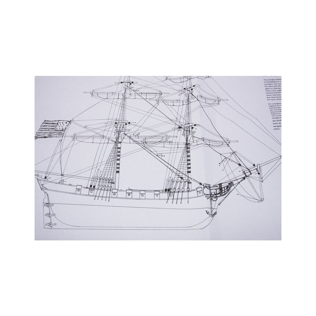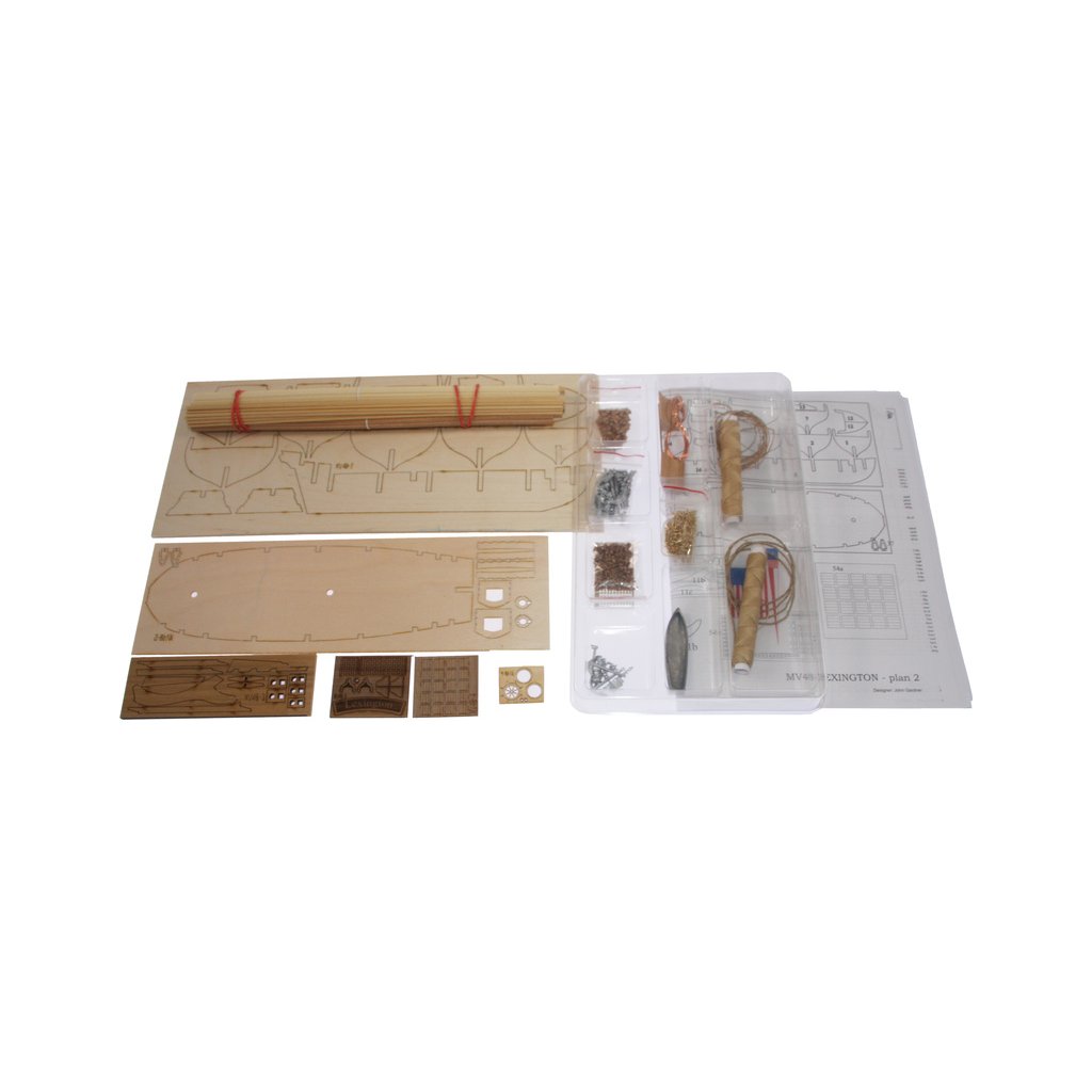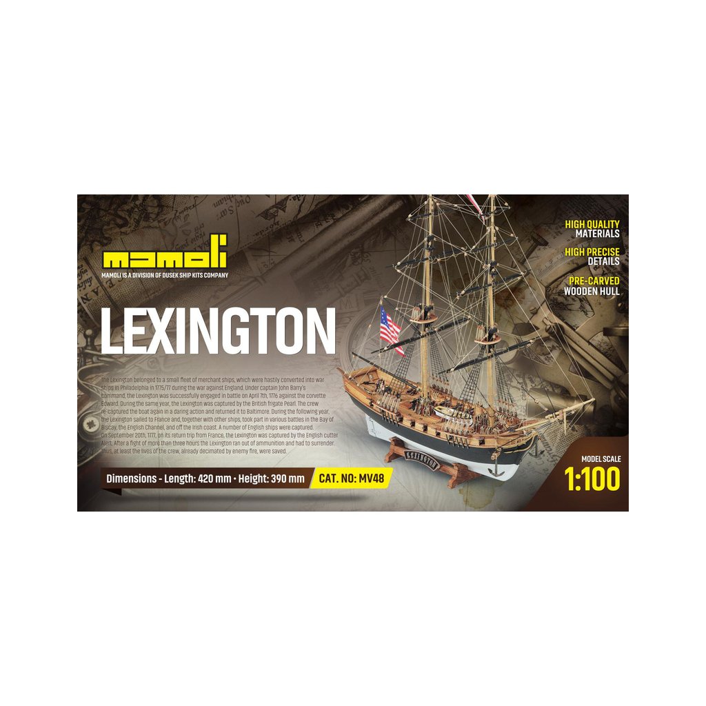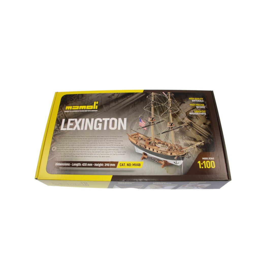 Stavebnice neplovoucího modelu MAMOLI Lexington v měřítku 1:100 z roku 1775. Loď patřila k lodím, které musely být přestavěny během války proti Anglii v roce 1775/77 ve Philadelphii, na válečné lodě. Lexington 7. dubna 1776 svedl vítěznou bitvu proti Corvetě Edward. V balení jsou dřevěné díly, lišty a množství kování, příslušenství, plány atd.