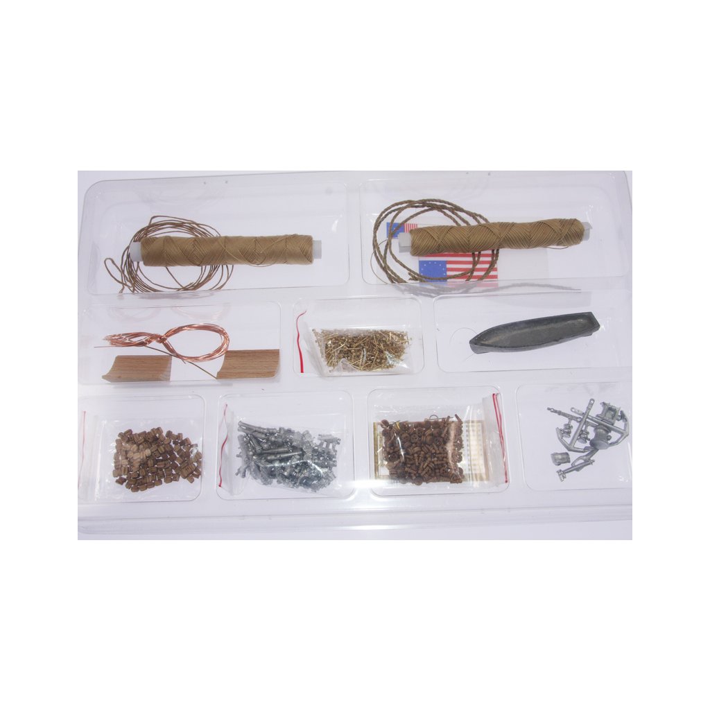 Balení obsahuje sadu překližkových dílů, sadu dřevěných lišt o různém průřezu, blistr s drobnými díly, sadu výkresů a manuál.