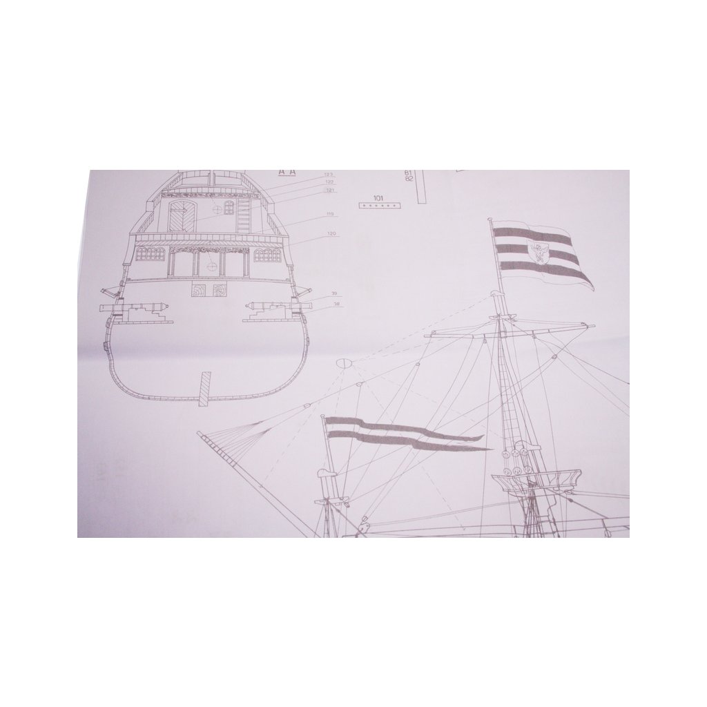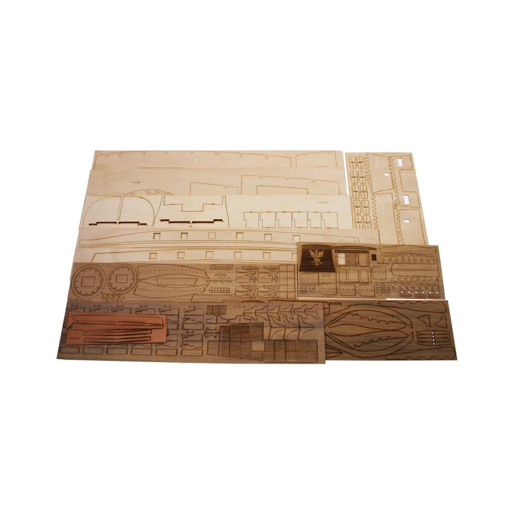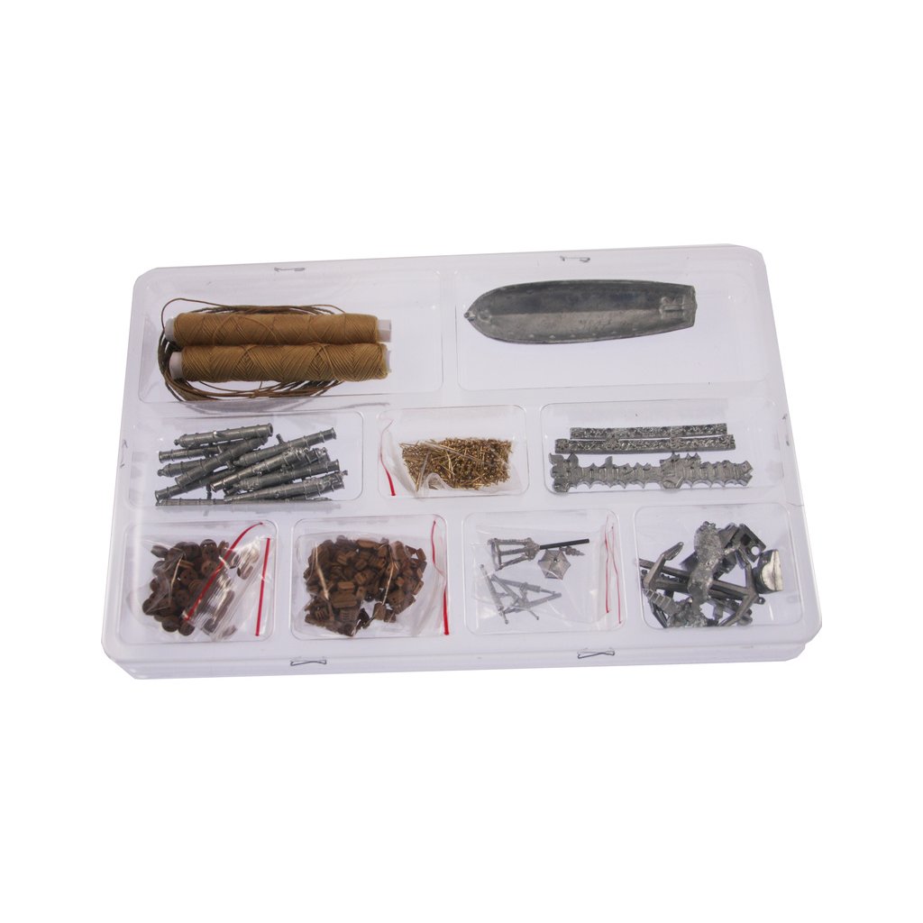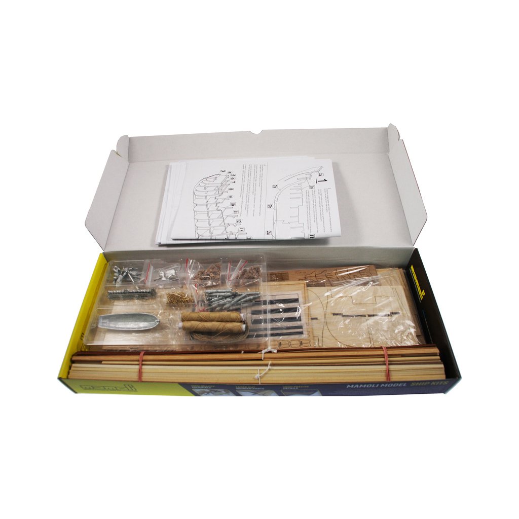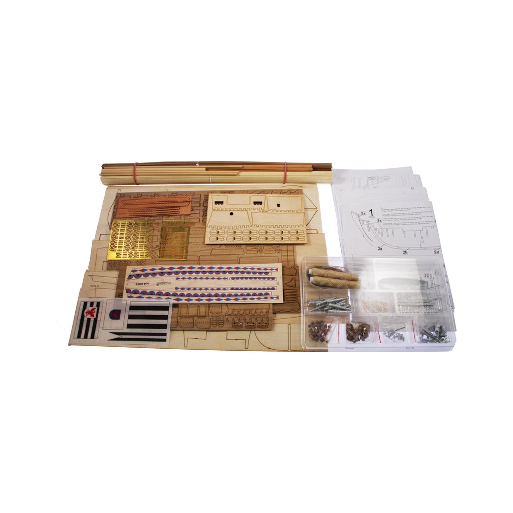 Balení obsahuje sadu překližkových dílů, sadu dřevěných lišt o různém průřezu, blistr s drobnými díly, mosazné lepty, vlajky, sadu výkresů a vícejazyčný manuál.
