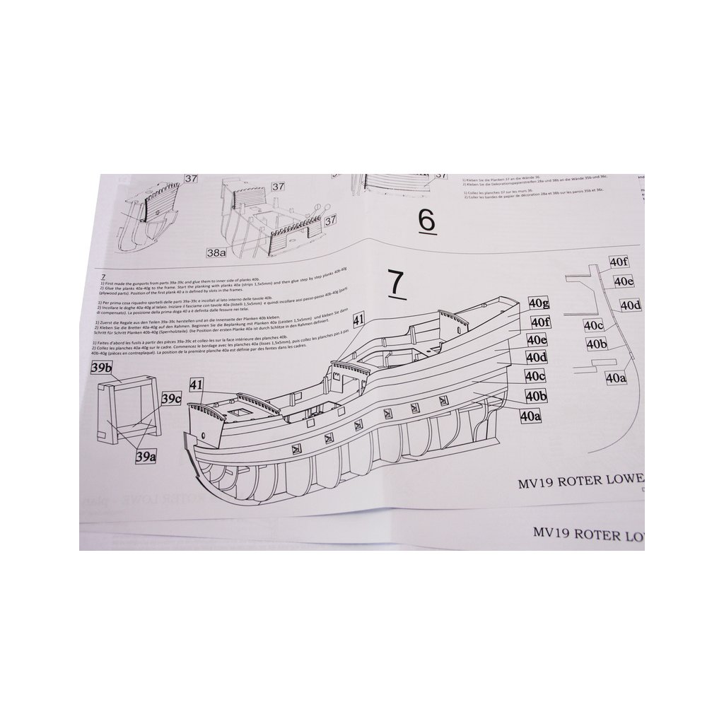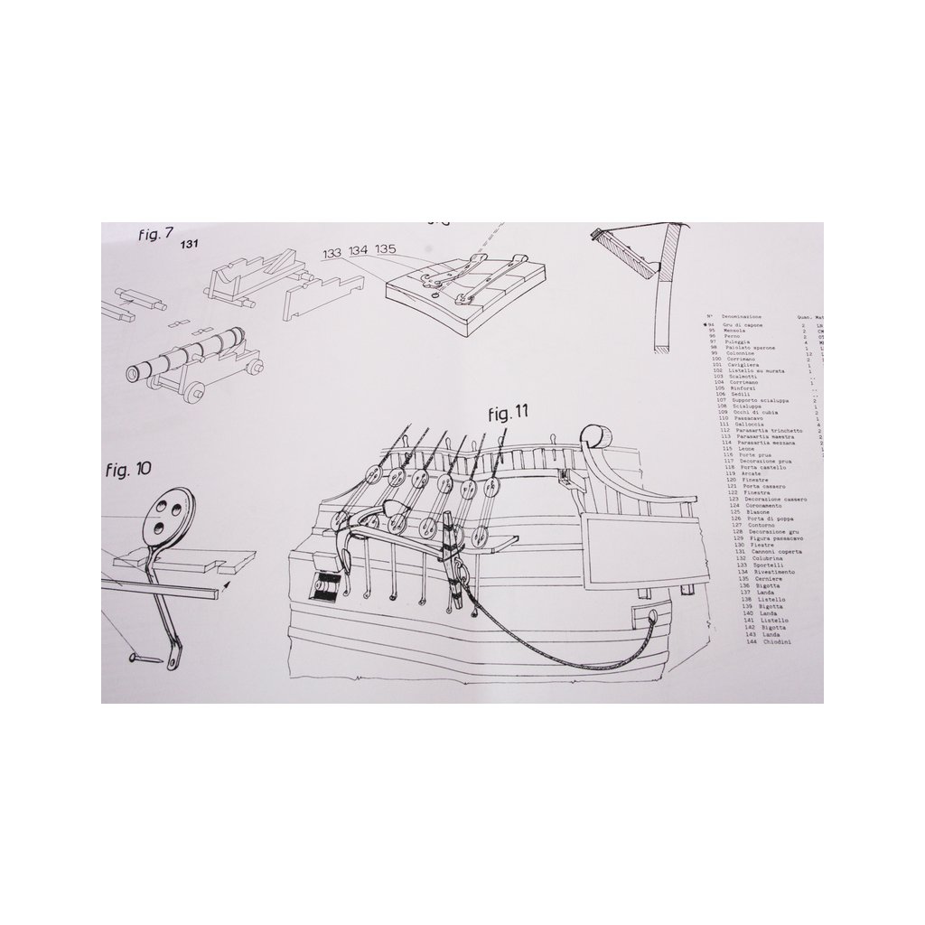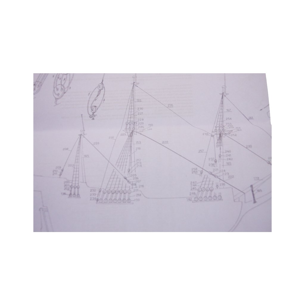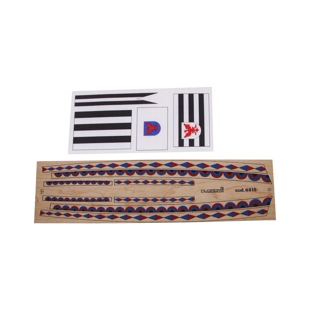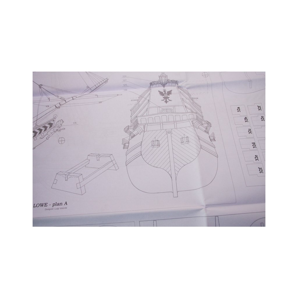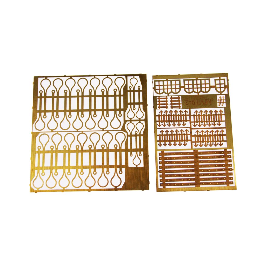 Balení obsahuje sadu překližkových dílů, sadu dřevěných lišt o různém průřezu, blistr s drobnými díly, mosazné lepty, vlajky, sadu výkresů a vícejazyčný manuál.