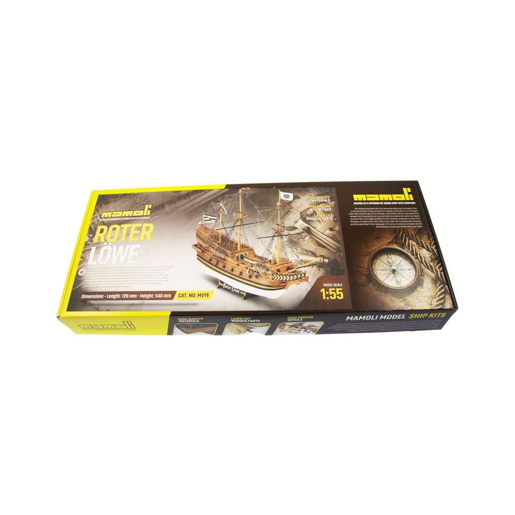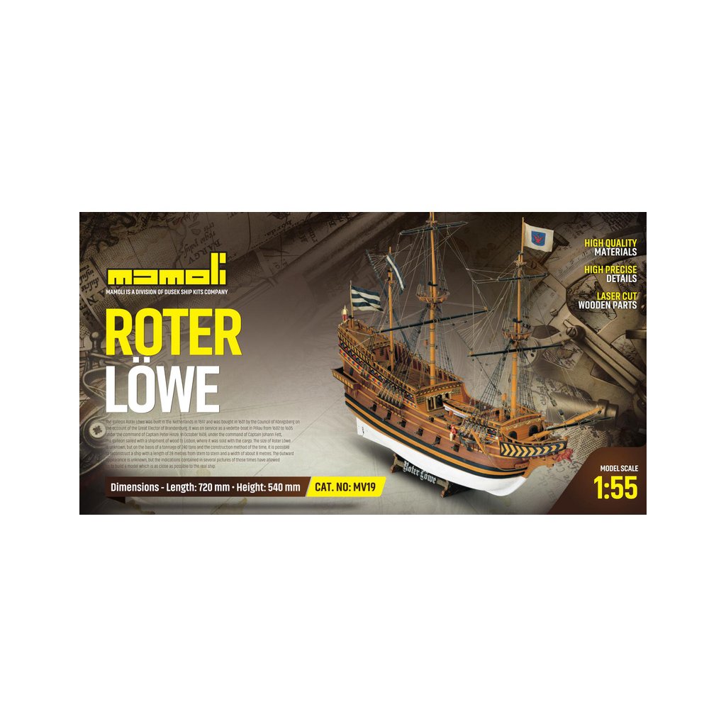 Stavebnice neplovoucího historického modelu plachetní lodi MAMOLI Roter Löwe z roku 1597, je v měřítku 1:55 a má celkovou délku 720mm. Galeona Roter Löwe byla postavena v Holandsku jako obchodní loď a pro radu města Königsberg v Brandenbursku byla zakoupena v roce 1561pro obranu přístavu. V balení jsou dřevěné díly, lišty a množství kování, lanoví, plány atd.