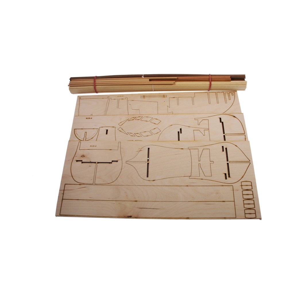 Po otevření víka krabice naleznete dřevěné díly modelu z překližky, sadu lišt, drobné součásti uzavřené v plastovém průhledném blistru, sadu výkresů a manuál.