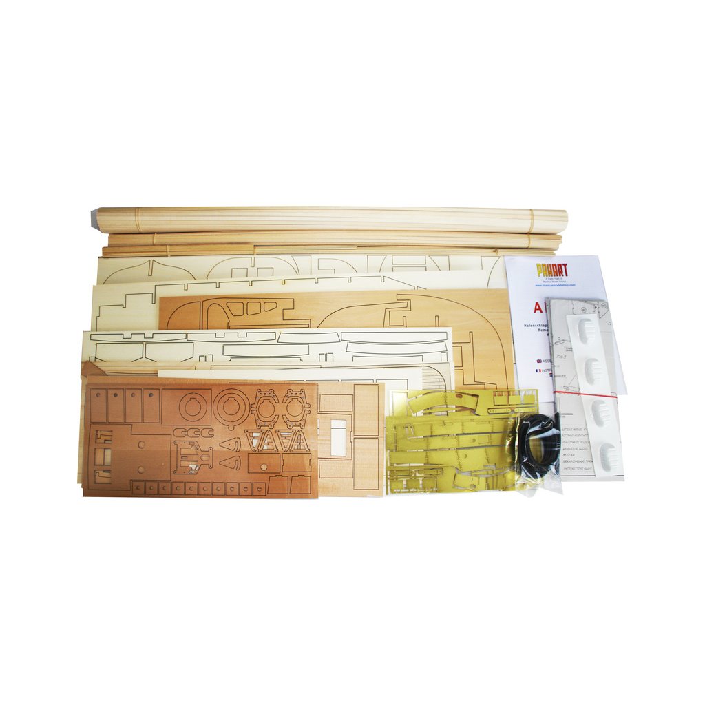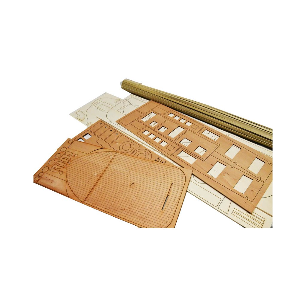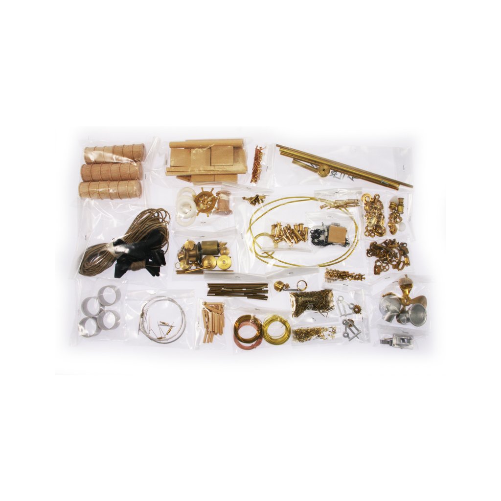 Balení obsahuje sadu překližkových dílů, sadu dřevěných lišt o různém průřezu, sáčky s drobnými díly, součásti z mosazného plechu, kovové odlitky, mosazné součásti na sestavení navijáku, kovový lodní šroub s hřídelí, plastová trubka na komín, kormidelní kolo, motouzy, gumové těsnění, plastový výlisek, sadu výkresů a vícejazyčný manuál.