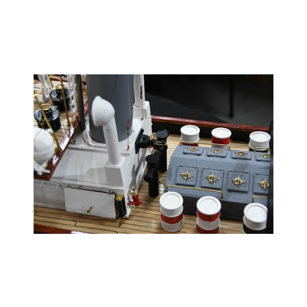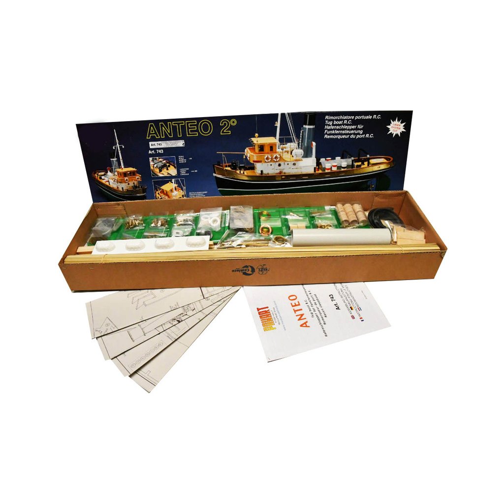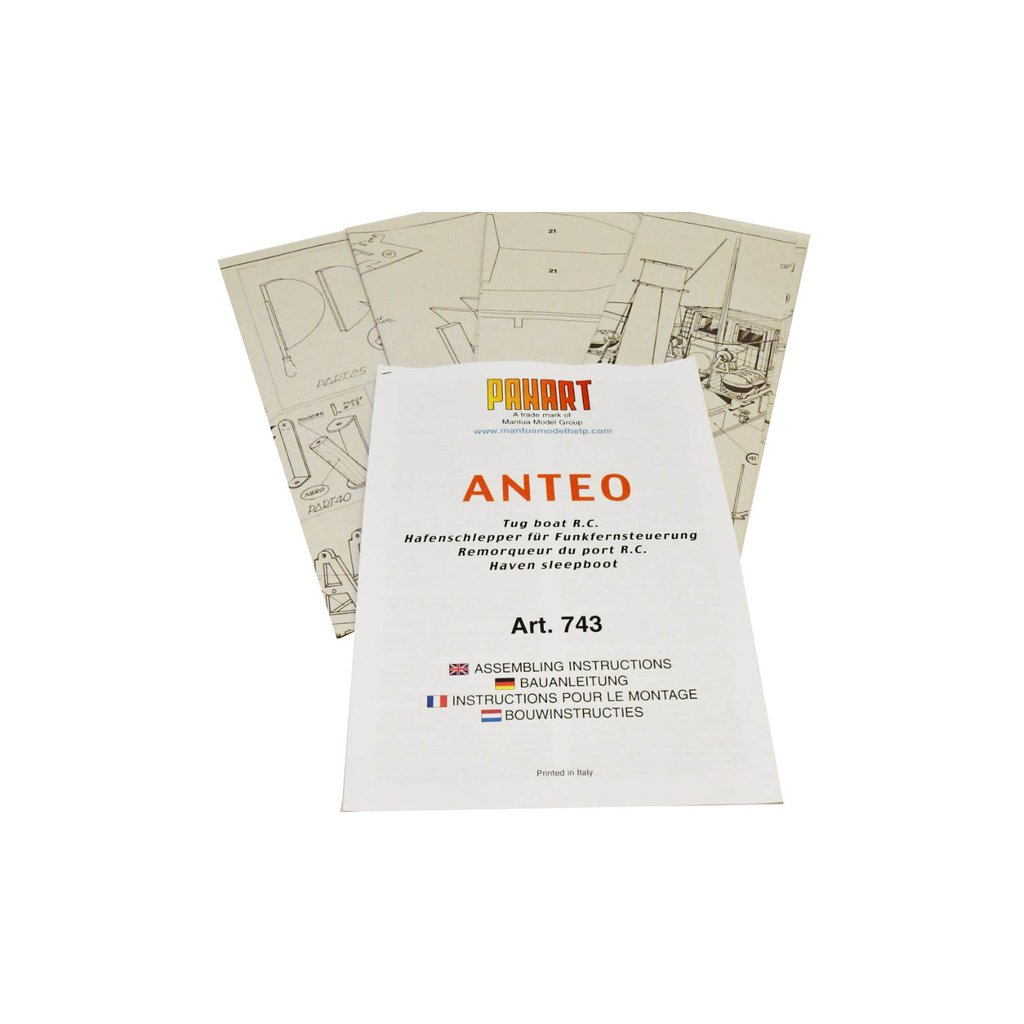 Trup je postaven klasickou konstrukcí s kýlem a přepážkami z dřevěných dílů řezaných laserem a různými prkny a lištami. Pokud je Anteo použit jako funkční model, doporučujeme potáhnout trup tenkou skelnou tkaninou, aby byla skořepina trupu odolnější. Nástavby jsou také sestaveny z dílů řezaných laserem a sestavení mnoha detailů na lodi je zábava. Sada maketových detailů je rozsáhlá a součástí balení je i záďová trubka se hřídelí pro lodní šroub. Kování je vyrobeno z lité mosazi a je té nejvyšší kvality. Jednotlivé díly jsou věrné originálu. Stavebnice s podrobnými stavebními plány a stavebními pokyny.