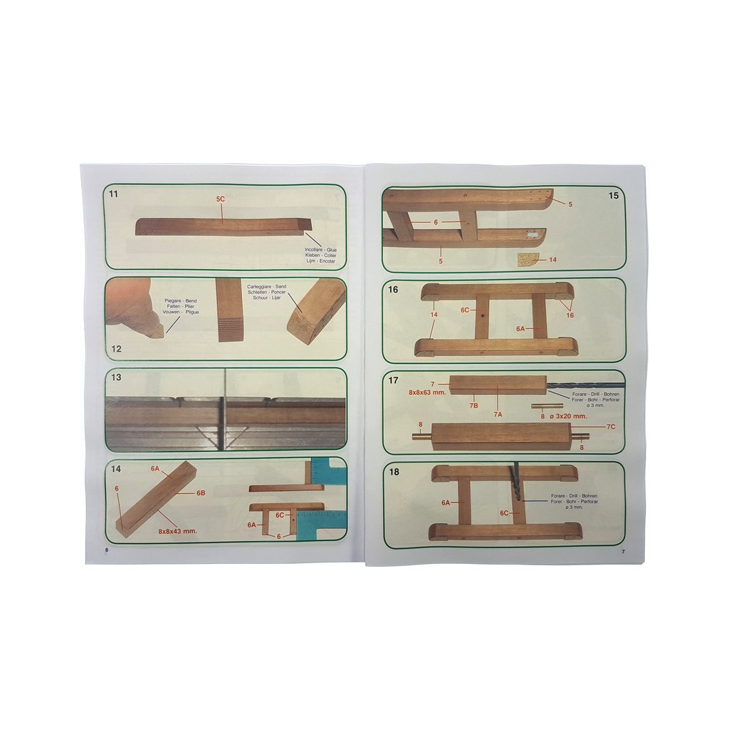 Balení obsahuje laserem vyřezávané dřevěné díly, kovové odlitky, lana, obrázkový návod ke stavbě.
