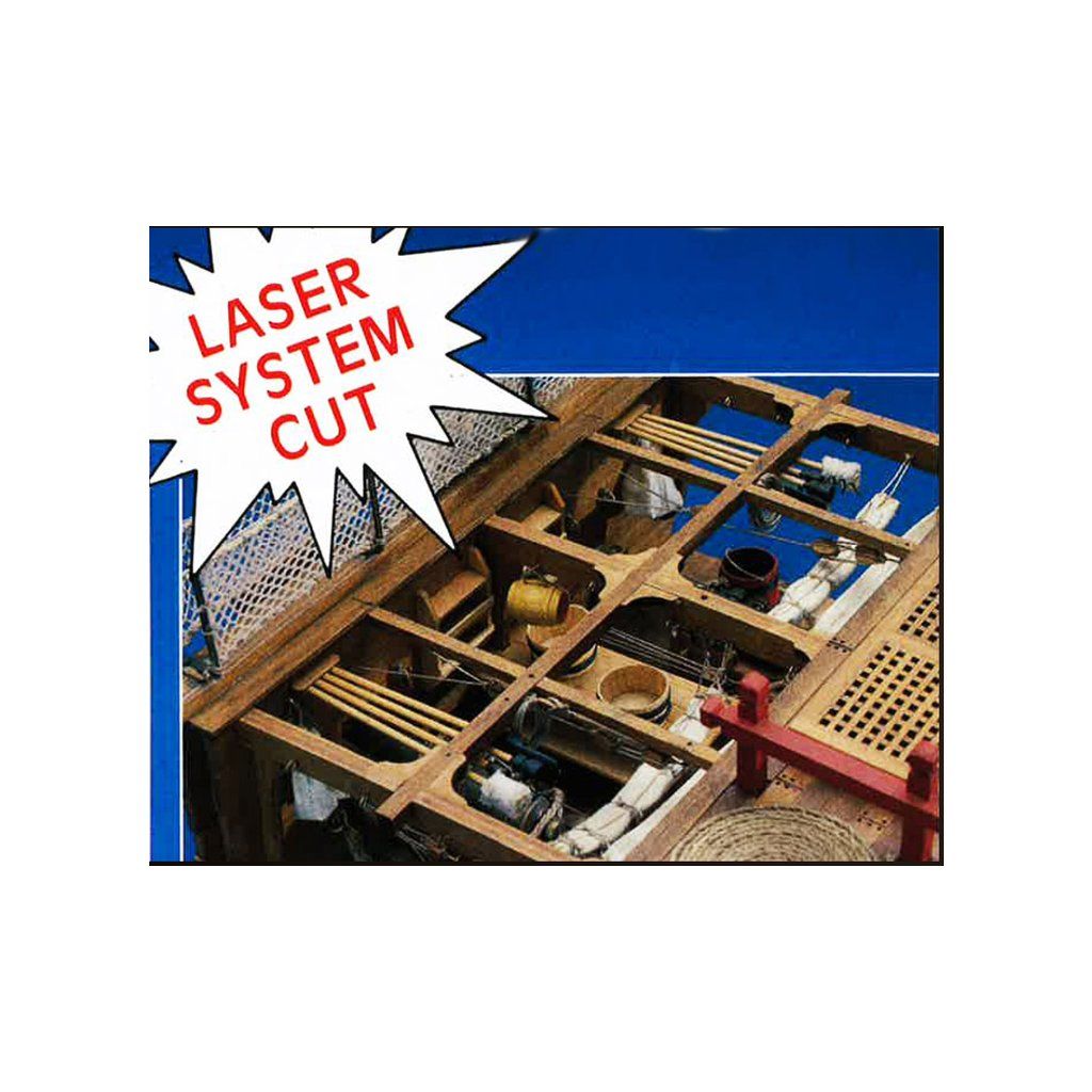 Kromě stavebního plánu vytištěného na obou stranách s mnoha podrobnými výkresy pomáhají s dokončením modelu ilustrované vícejazyčné stavební pokyny. Zajímavý a podrobný model je řez typickou anglickou bojovou lodí z počátku 19. století. Všechny dřevěné součásti jsou řezány laserem, dvojité lamely pro opláštění, dvě zdobená mosazná děla, všechna potřebná dřevěná a kovová kování spolu se stavebními plány s obecnými pokyny.