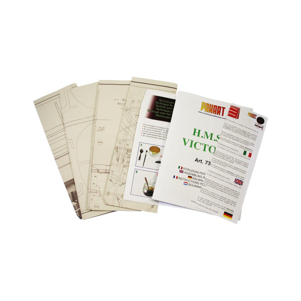 Stavebnice velké neplovoucí makety Mantua Model HMS Victory Panart v měřítku 1:78 a délce 1,3m. Skvělý model vlajkové lodi admirála Lorda Nelsona z bitvy u Trafalgaru. obsáhlá stavebnice obsahuje dřevěné díly vyřezané laserem, spoustu maketových detailů, mosazných leptů a kovových odlitků, stavební plány a návod v italštině, angličtině a němčině. Součástí je také stojánek lodi.