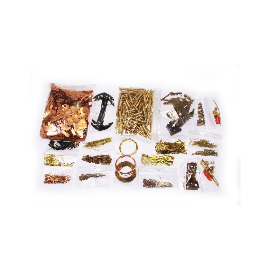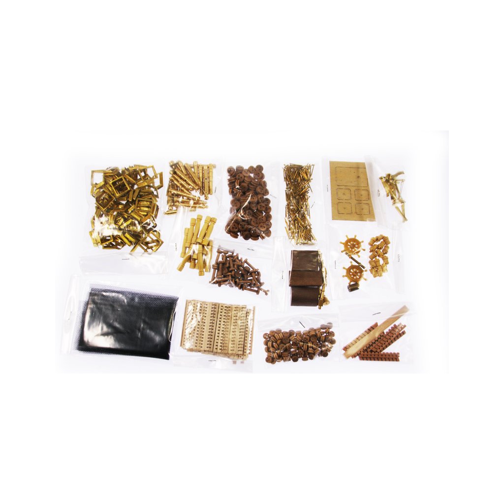 Balení obsahuje sadu překližkových dílů, sadu dřevěných lišt o různém průřezu, blistr s drobnými díly, díly z mosazi, sadu výkresů a vícejazyčný manuál.