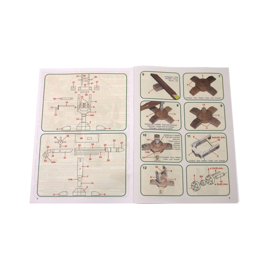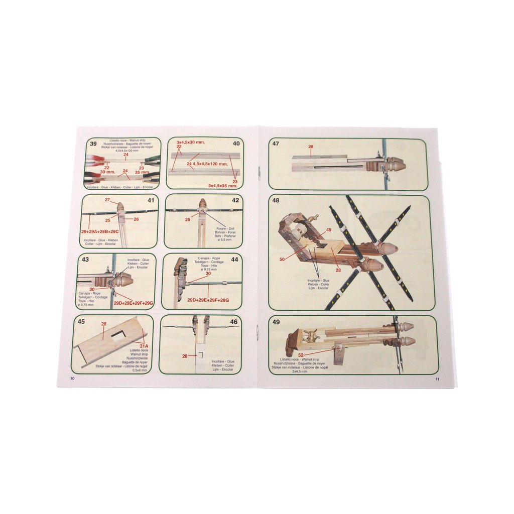 Balení obsahuje laserem vyřezávané dřevěné díly, kovové odlitky, obrázkový návod ke stavbě.