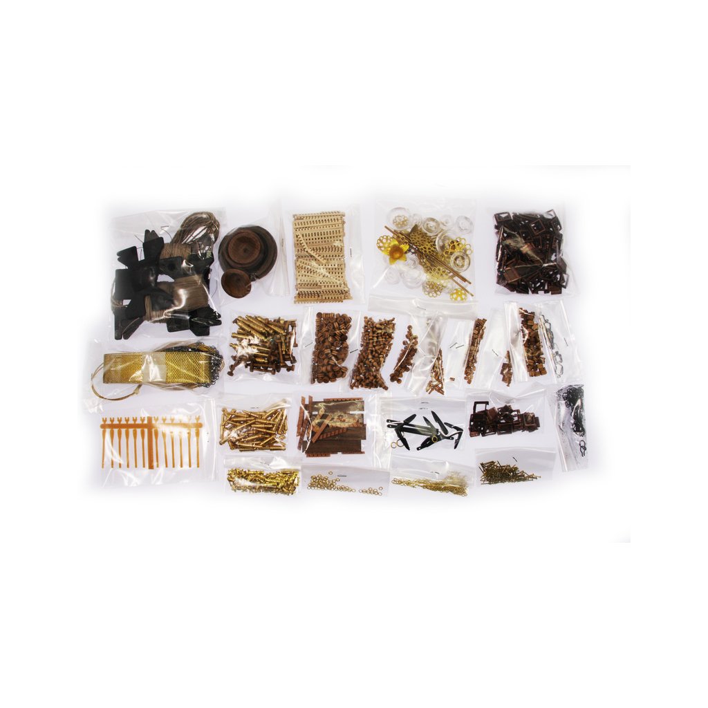 Po otevření víka krabice naleznete dřevěné díly modelu z překližky, sadu lišt, drobné součásti uzavřené v sáčcích, sadu výkresů a manuál.