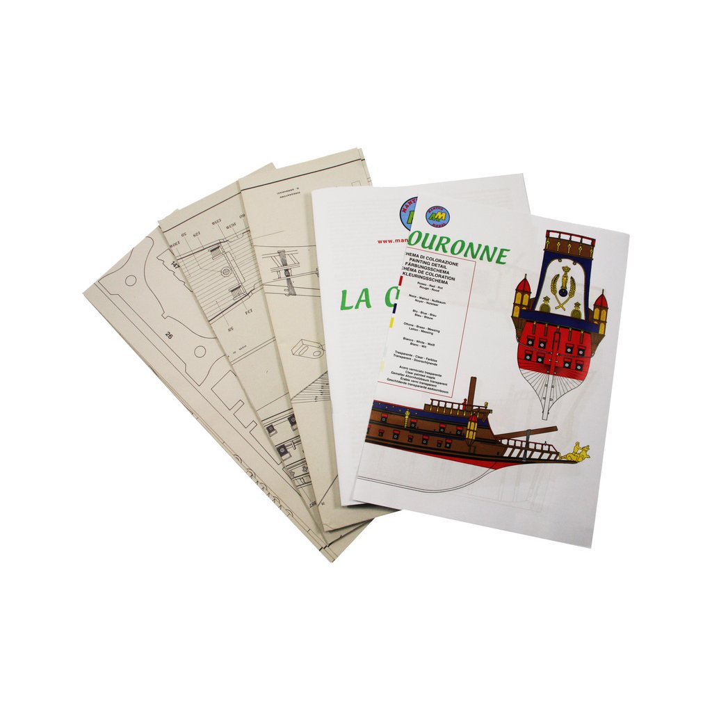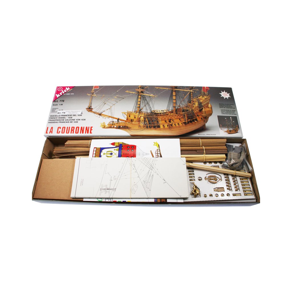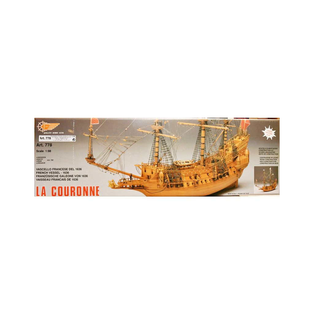 Stavebnice velké neplovoucí makety Mantua Model La Couronne v měřítku 1:98 a délce 760mm. Skvělý model lodi kardinála Richelieu. Obsáhlá stavebnice obsahuje dřevěné díly vyřezané laserem, spoustu maketových detailů, mosazných součástí a kovových odlitků, stavební plány a návod v italštině, angličtině a němčině. Součástí je také stojánek lodi.
