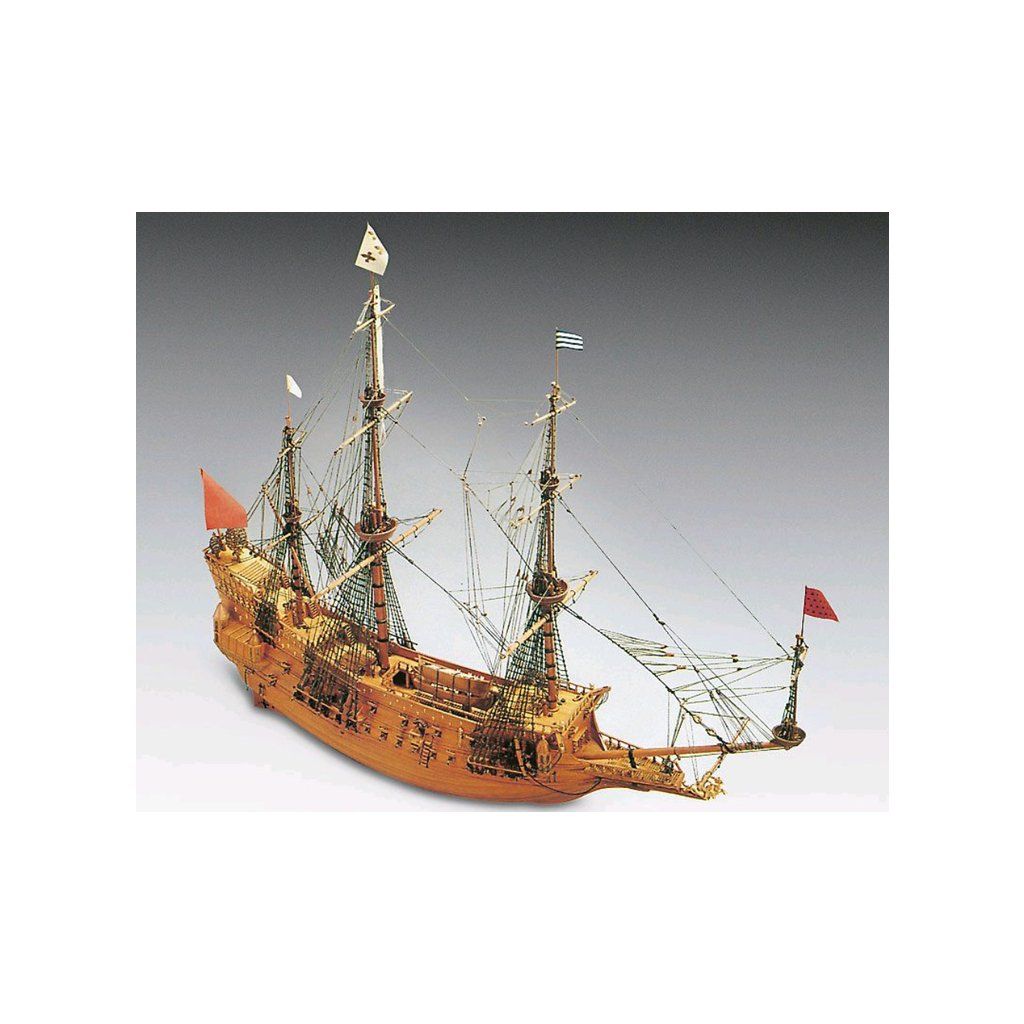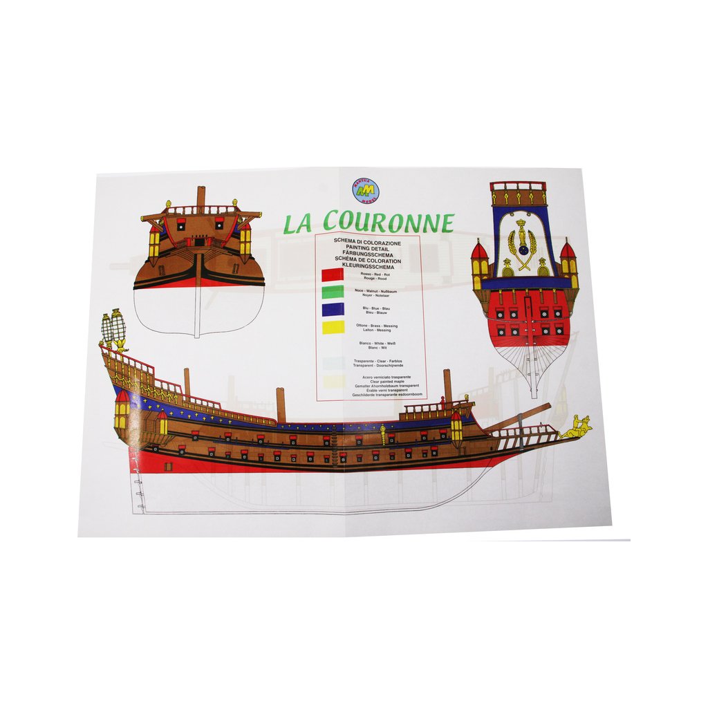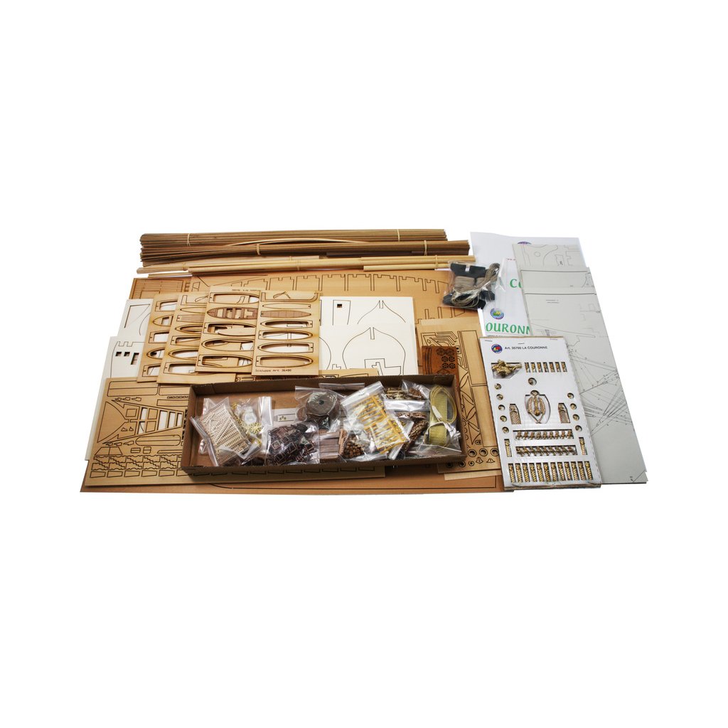 Stavebnice velké neplovoucí makety Mantua Model La Couronne v měřítku 1:98 a délce 760mm. Skvělý model lodi kardinála Richelieu. Obsáhlá stavebnice obsahuje dřevěné díly vyřezané laserem, spoustu maketových detailů, mosazných součástí a kovových odlitků, stavební plány a návod v italštině, angličtině a němčině. Součástí je také stojánek lodi.