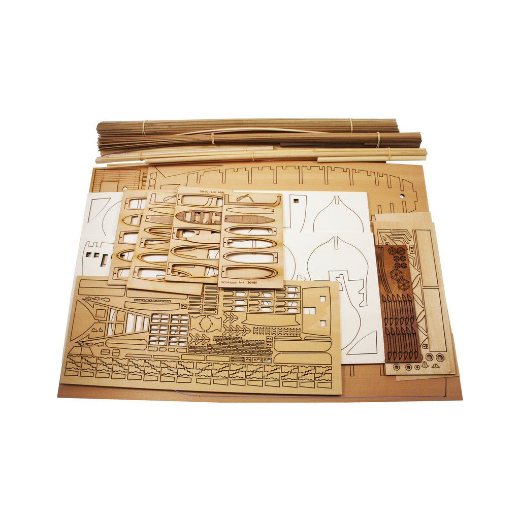 Balení obsahuje sadu překližkových dílů, sadu dřevěných lišt o různém průřezu, sáčky s drobnými díly, odlitky z kovu, sady motouzů na lanoví, sadu výkresů a vícejazyčný manuál.