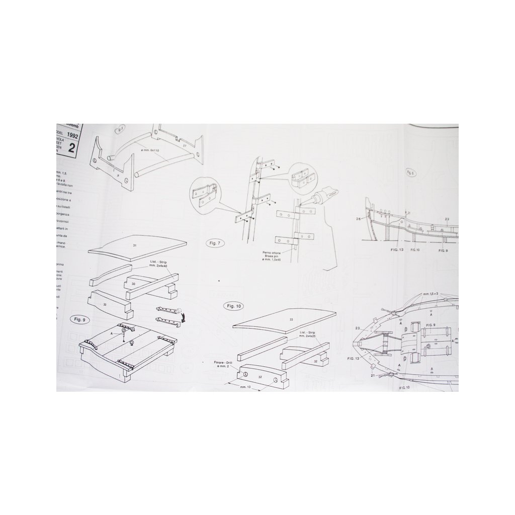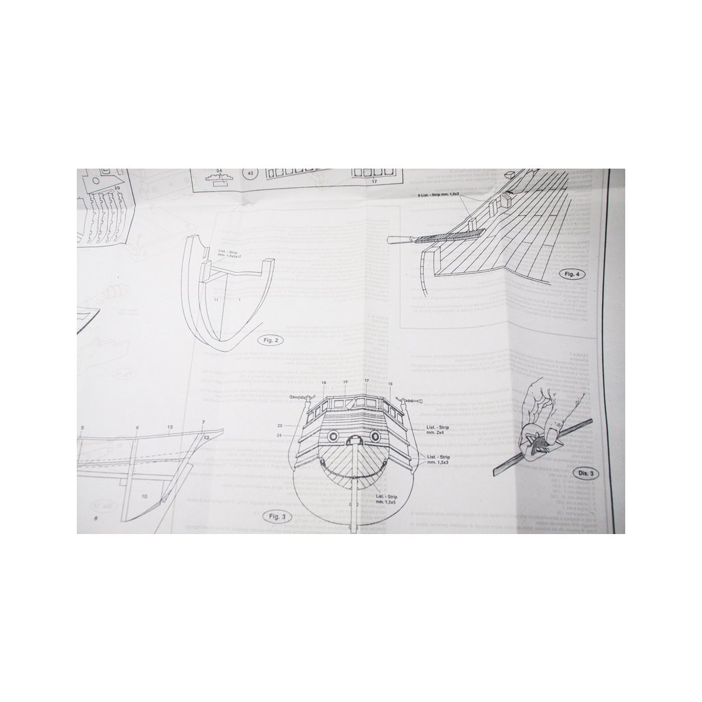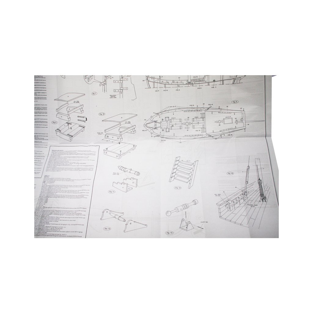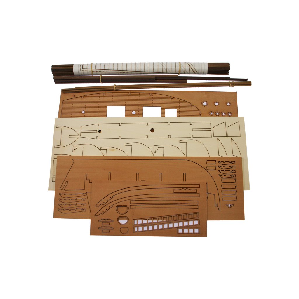 Balení obsahuje laserem řezané dřevěné díly, plaňky, paluby, stožáry, kovové a dřevěné kování, kovové odlitky. Stavební plány, manuál.