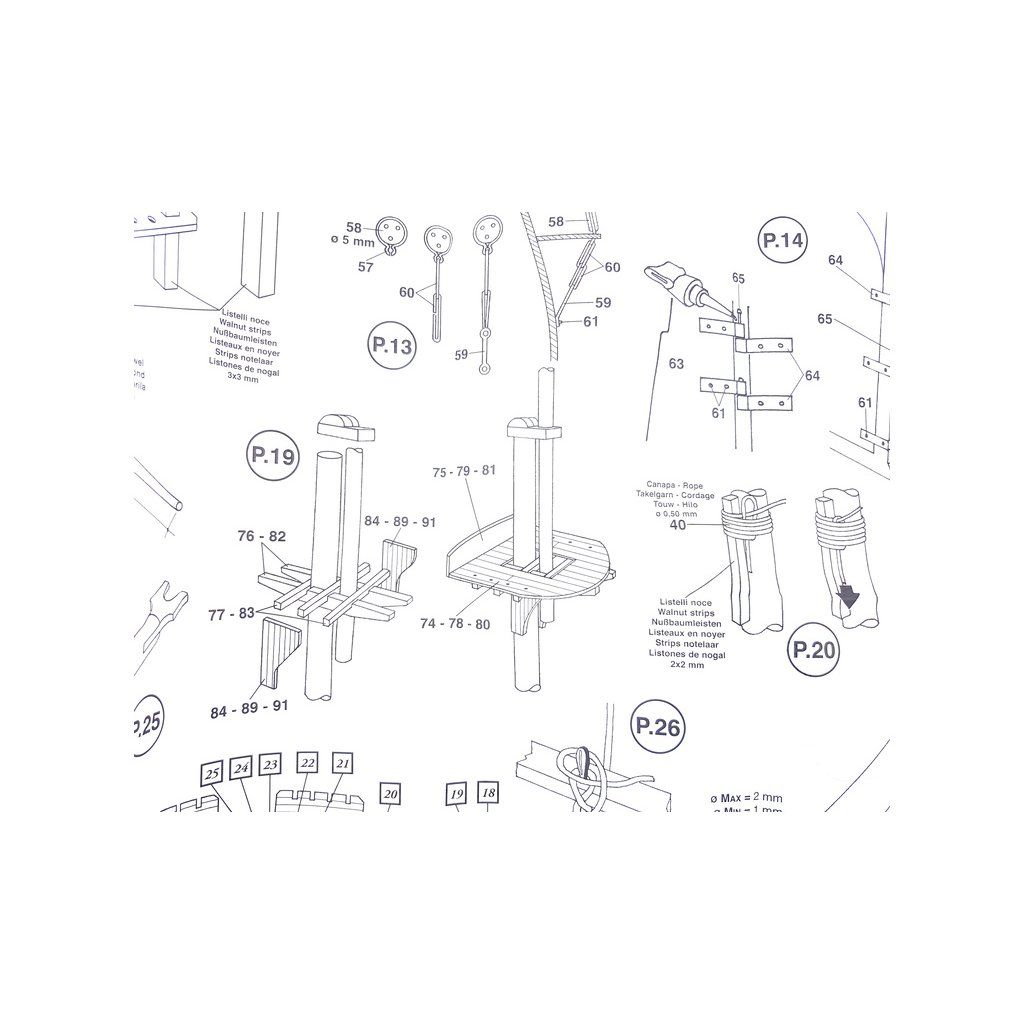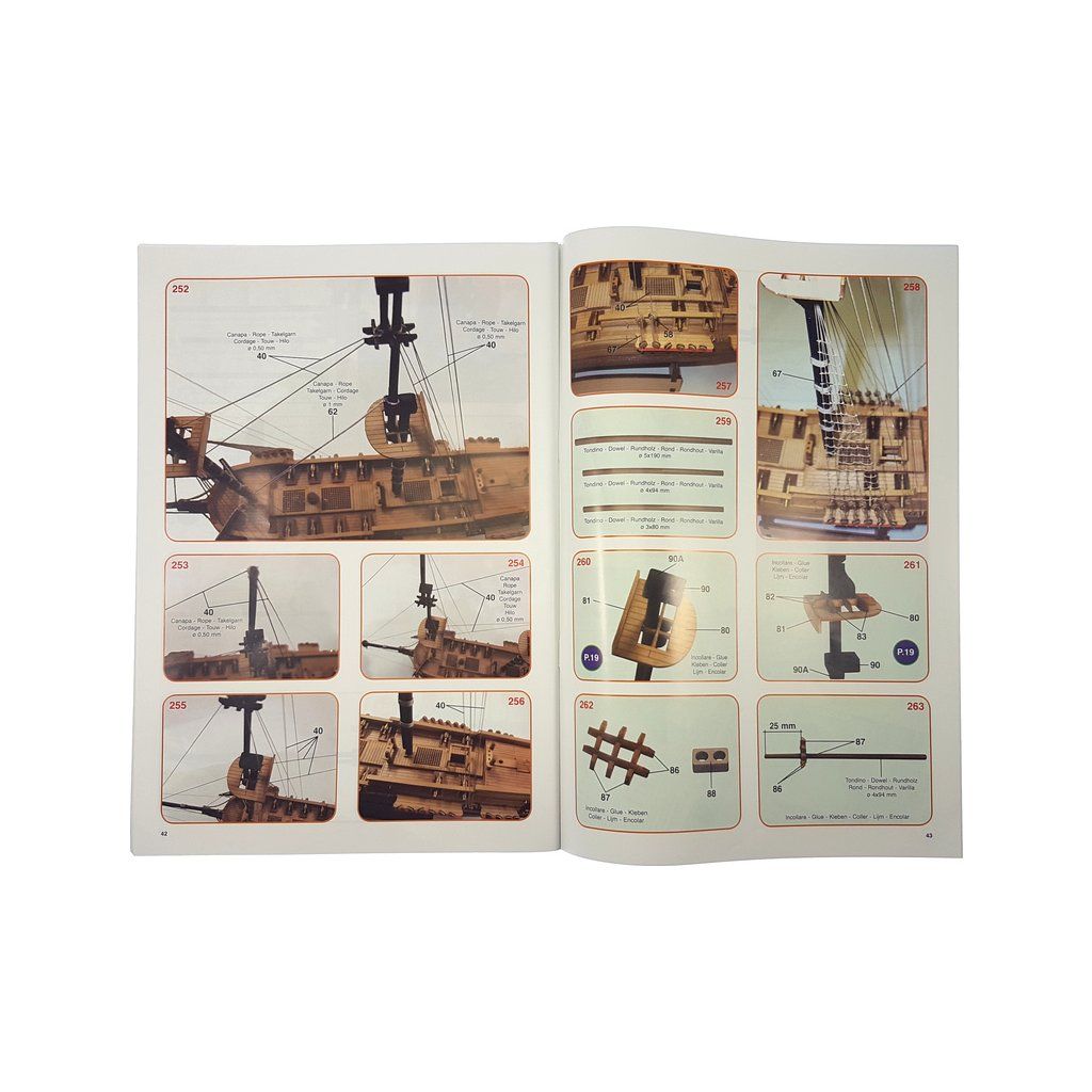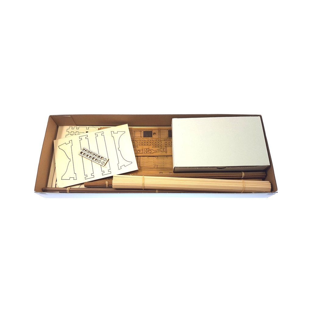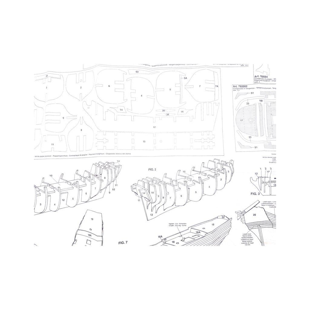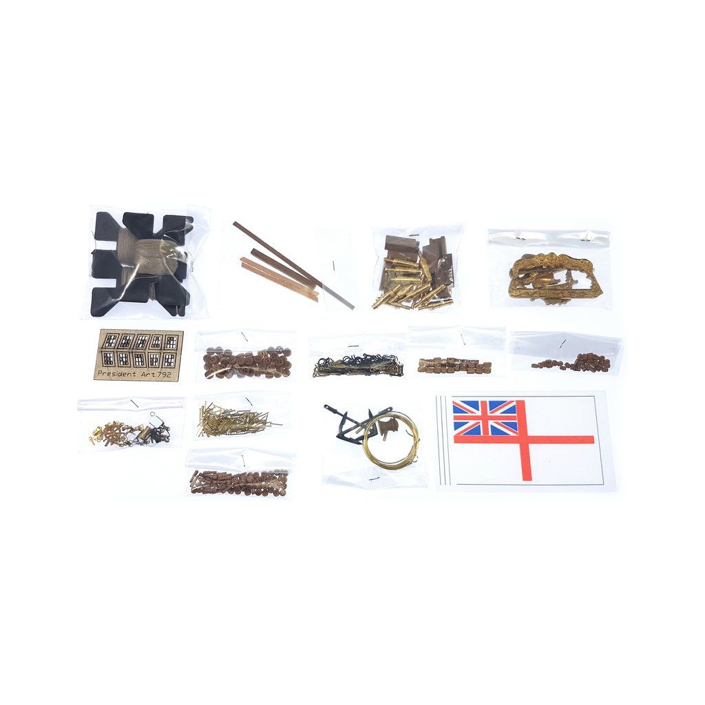 Balení obsahuje laserem řezané dřevěné díly, plaňky, stožáry, vlajku, lanoví a dekorace z mosazných odlitků. Stavební pokyny EN, DE, IT.