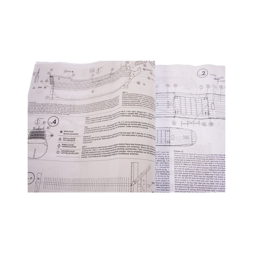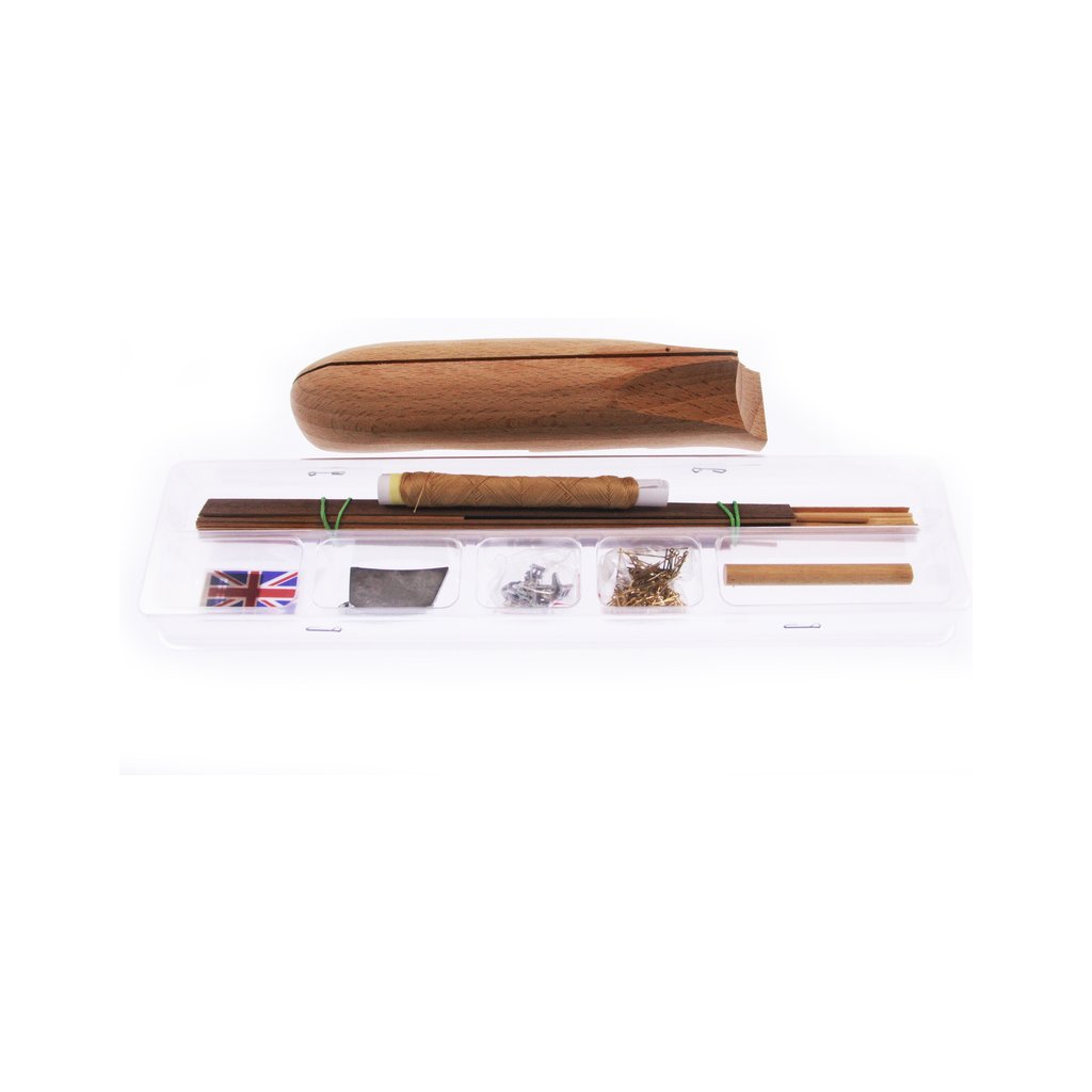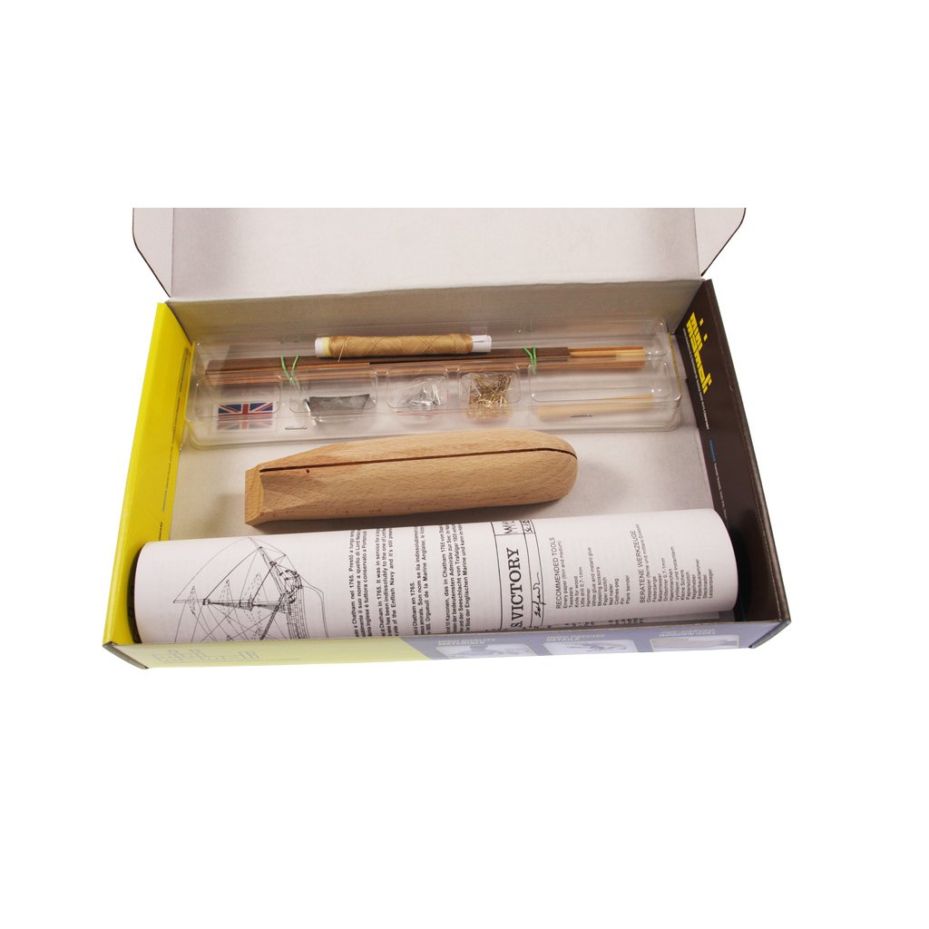 Balení obsahuje sadu překližkových dílů, sadu dřevěných lišt o různém průřezu, blistr s drobnými díly, sadu výkresů a manuál anglický, německý, francouzský a italský.