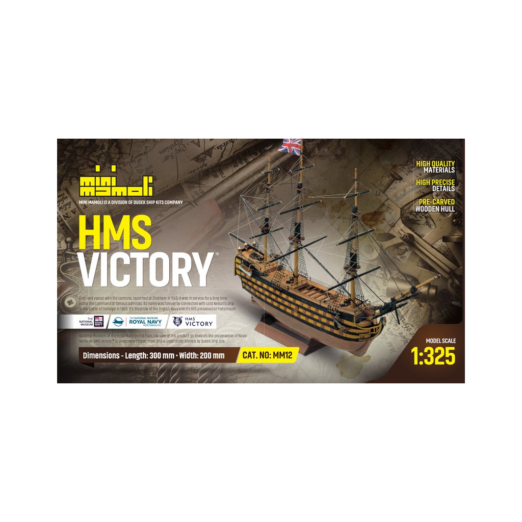 Model lodi H.M.S. Victory, z řady Mini Mamoli, v měřítku 1:325. Vhodné pro začínající modeláře. Victory se zúčastnila bitvy u Trafalgaru 21. října 1805 pod vlajkou admirála Sira Horatio Nelsona, ve kterém Angličané porazili francouzsko-španělskou flotilu. Posádka čítala 850 mužů. Model lze sestavit během několika hodin. Vhodné od 14 let.