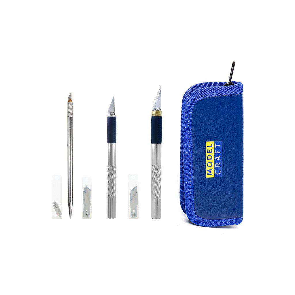 Modelcraft modelářské nože v pouzdru (sada 18 ks) - modelářská řezací sada v praktické pouzdře obsahuje: malý nůž s rydlem a čepelí, profesionální nůž malý a profesionální nůž velký. Přiložené výměnné čepele různých typů pro široké spektrum řezů.