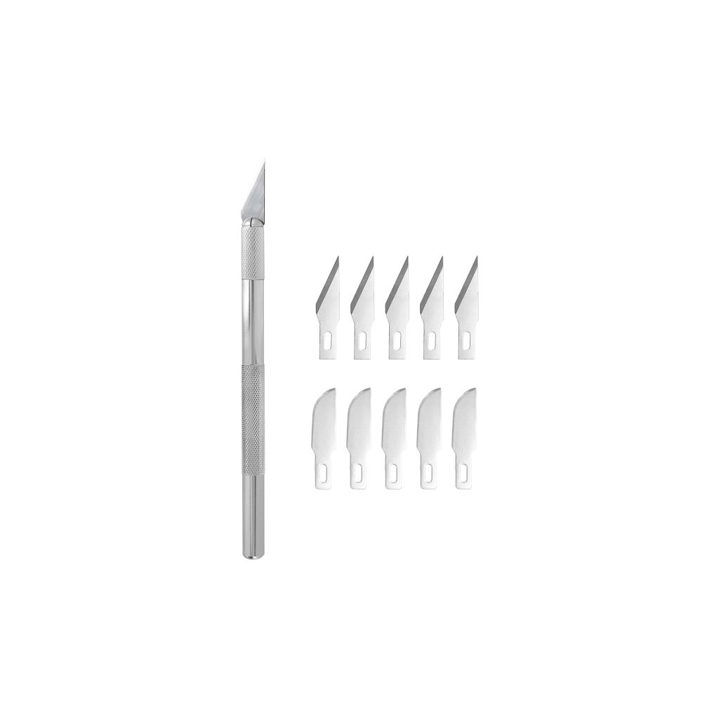 Klasický celokovový modelářský nůž s držákem čepelí #1 a 10 výměnnými čepelemi (5 rovných, 5 oblých) pro řemeslníky, modeláře a profesionály.