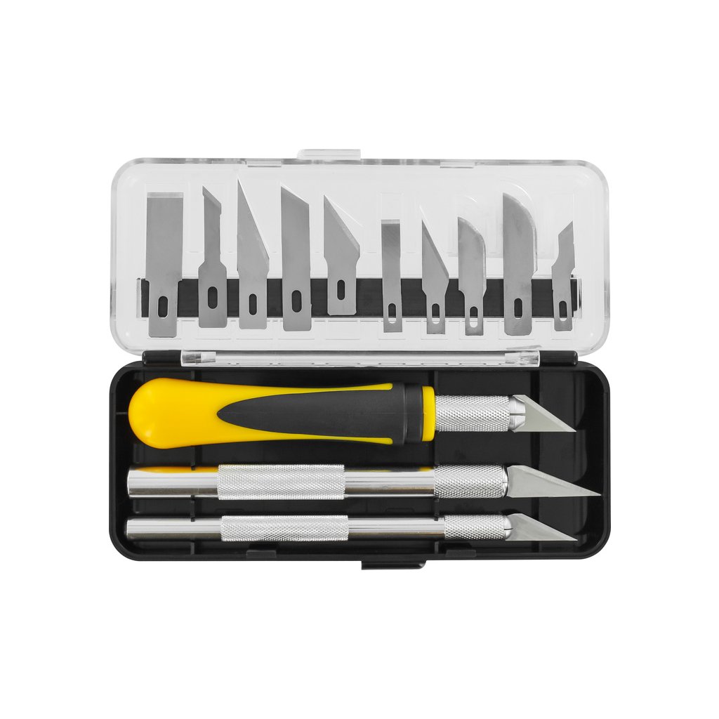 Modelcraft sada 3 nožů s 13 čepelemi se skládá ze 3 držáků velikostí #1 malý, #2 střední a #5 velký a 13 různých čepelí. Použití pro jemné rovné i oblé řezy. Pro řemeslníky, modeláře a profesionály. Sada je uložena v praktickém pouzdru, čepele na magnetickém pásku.
