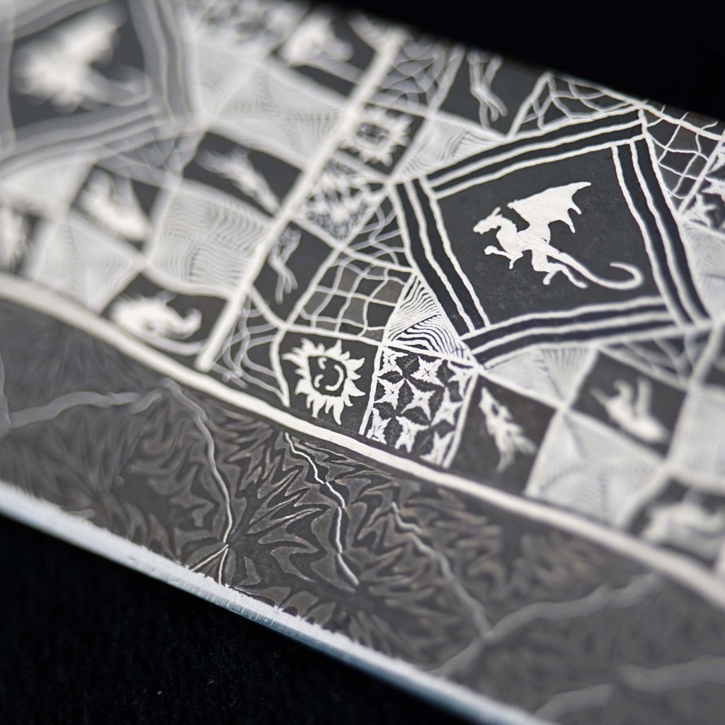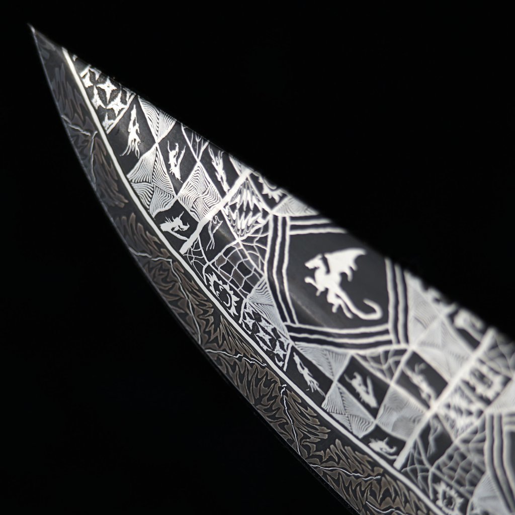 Model EVIL DRAGON ve variantě Nr. 12 je ztělesněním luxusu mezi outdoor nástroji. Čepel z laminované oceli o tvrdosti 60 HRC poskytuje neuvěřitelnou řezivost a trvanlivost ostří. Rukojeť zdobí certifikovaný mamutí kel, jehož stáří přesahuje 10 000 let, doplněný o vysoce estetický TIMASCUS. Tento myslivecký unikát není jen nástrojem, ale kusem historie, který ocení každý sběratel špičkového bushcraft vybavení.