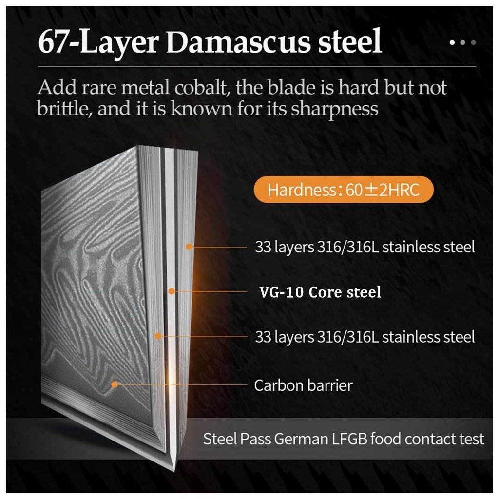 Nože Dellinger Longevity Damascus Edition mají velmi ostré řezné jádro z oceli 10Cr15CoMoV - ekvivalent japonské VG-10, s vysokou tvrdostí a výbornou odolností, které je velmi dobře chráněno proti korozi a vnějšímu mechanickému poškození. Ocel 10Cr15CoMoV má jedinečnou ostrost při tvrdosti R61 +/- 1 Rockwella. Jádro je vloženo mezi 66 vrstev 2 nerezových ocelí rozdílných tvrdostí (damascus steel), které zajišťují mimořádnou odolnost a houževnatost. Dokonale vyvážená, přesně zúžená čepel japonského tvaru s třpytivým damascénským vzorem STORMY WAVES minimalizuje tření při řezu a zabraňuje přilepení krájeného materiálu k čepeli. Damascénský vzor připomínající rozbouřené moře STORMY WAVES je jedinečný, neopakovatelný a stane se symbolem Vaší individuality.