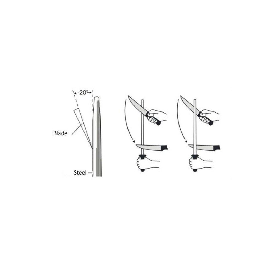 Umístěte plastový hrot na konci ocílky na pevný a odmaštěný povrch. Přitlačte směrem dolů, abyste zabránili sklouznutí během používání. Volným tahem (bez použití tlačné síly) pod úhlem cca 20 stupňů několikrát opakujte přejížděním fazety ostří nože na povrchu ocílky. Ostřete nůž od paty nože, až ke špičce, a opakujte 2-3 krát, pak otočte na druhou stranu nože, dokud nebude ostří dostatečně ostré.