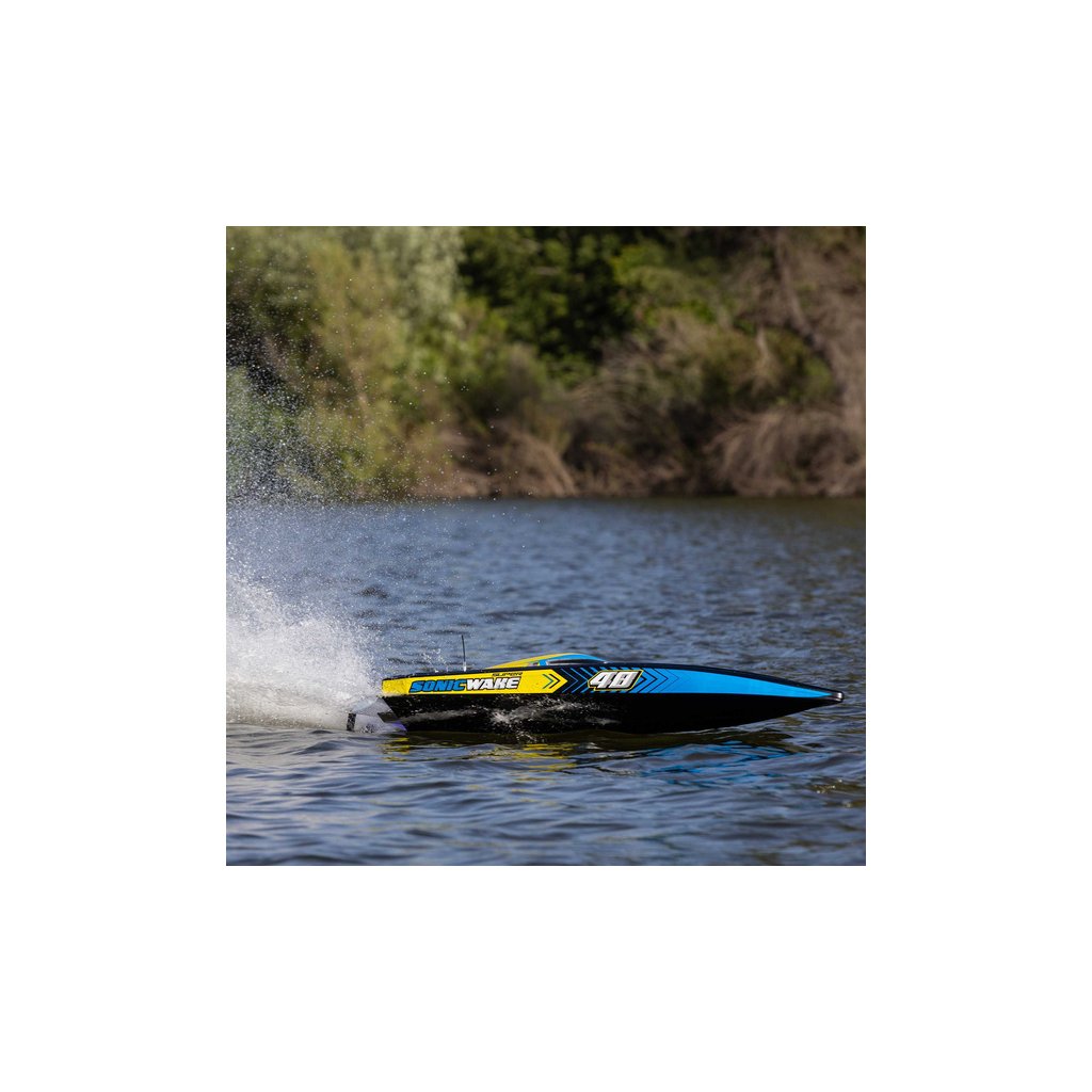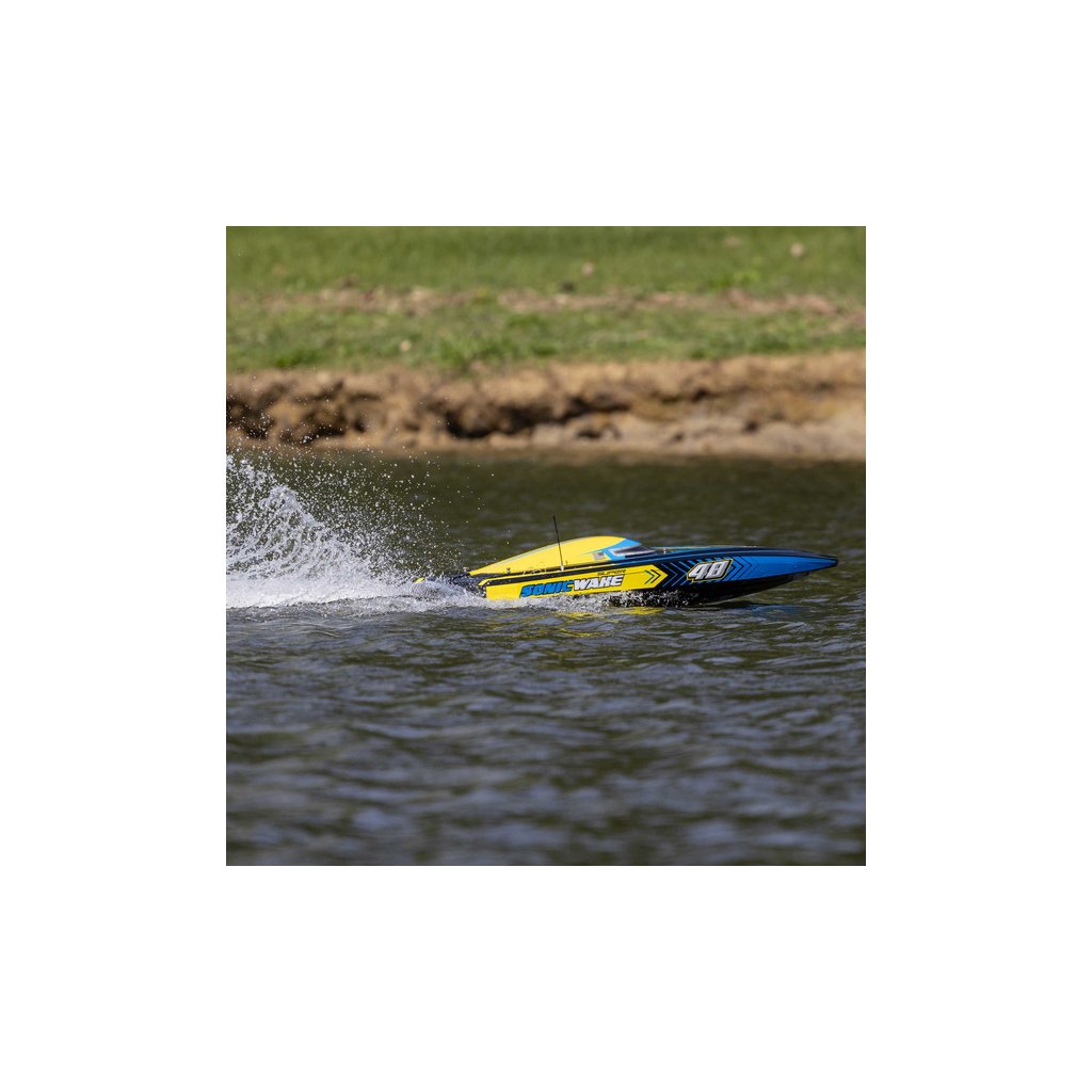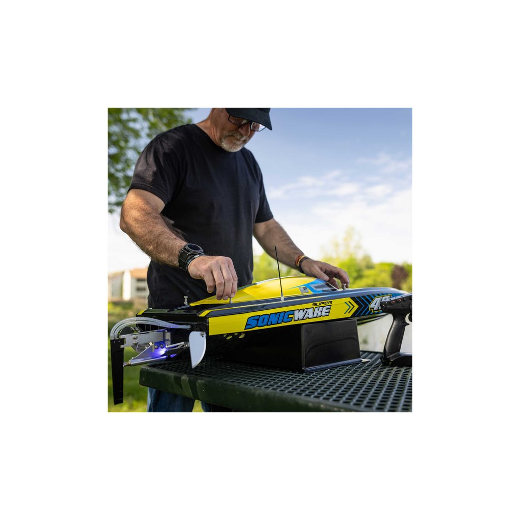 Díky své rychlosti a velikosti, je Super Sonicwake 48” nejvhodnější pro velká jezera, přehrady apod. Bezpečná a pohodlná jízda z okraje vody je bez starostí. Pokud se loď převrátí, sama se otočí zpět. Indikátor stavu nabití baterie na vysílači Spektrum DX3 vám dá vědět, kdy byste se měli vrátit na břeh. Super Sonicwake 48” se chystá odplavit všechny ostatní lodě z vody s nejlepšími funkcemi, nejlepším výkonem a největší velikostí.