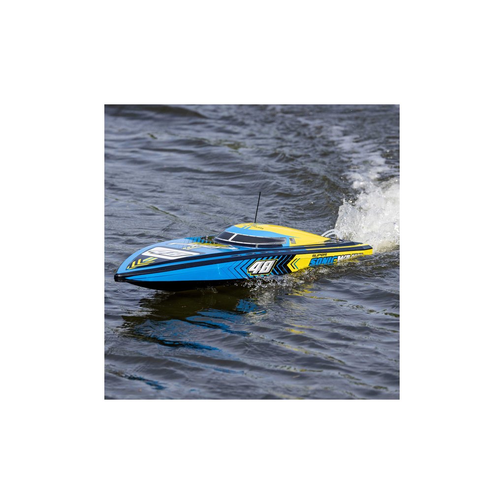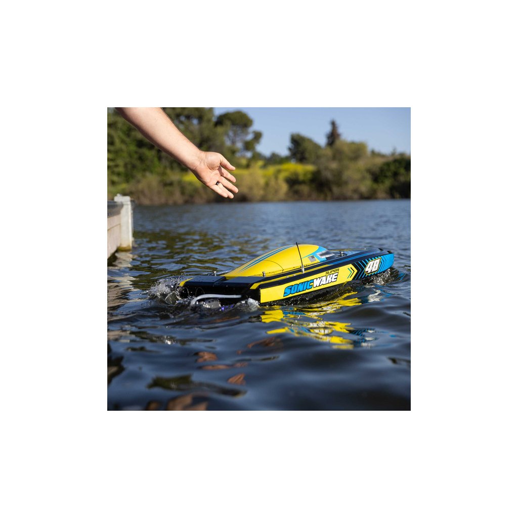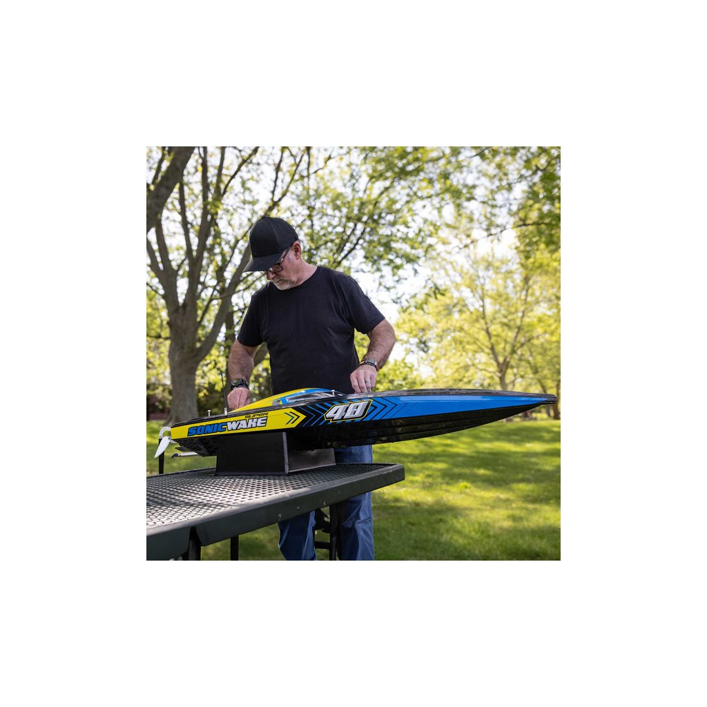 Díky své rychlosti a velikosti, je Super Sonicwake 48” nejvhodnější pro velká jezera, přehrady apod. Bezpečná a pohodlná jízda z okraje vody je bez starostí. Pokud se loď převrátí, sama se otočí zpět. Indikátor stavu nabití baterie na vysílači Spektrum DX3 vám dá vědět, kdy byste se měli vrátit na břeh. Super Sonicwake 48” se chystá odplavit všechny ostatní lodě z vody s nejlepšími funkcemi, nejlepším výkonem a největší velikostí.