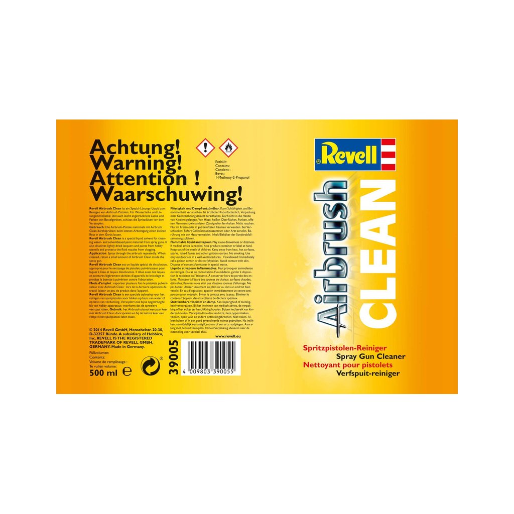 Určeno pro modelářství. Revell Airbrush Clean je speciální tekuté rozpouštědlo pro čištění barev na vodní bázi a na bázi rozpouštědla ze stříkacích pistolí. Také rozpouští lehce zaschlé laky a barvy z dalších modelářských potřeb a chrání trysky před zanesením.