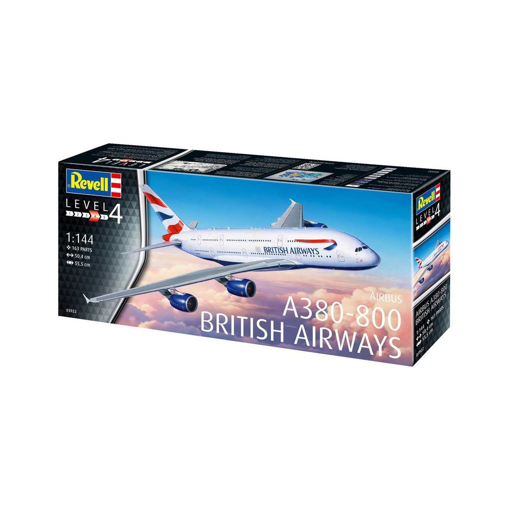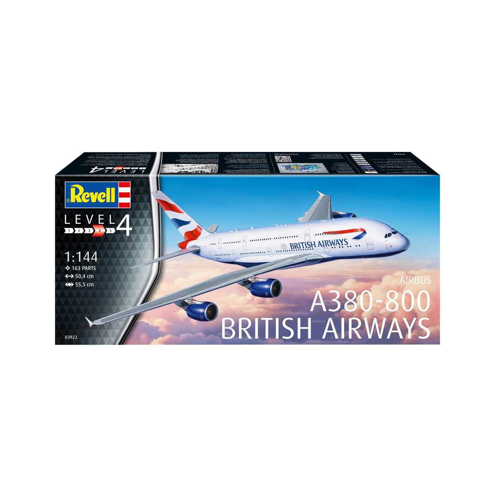 Plastikový model Revell 03922 – letadlo Airbus A380-800 British Airways v měřítku 1:144 ke slepení. Stavebnice obsahuje 163 dílků, rozpětí křídel 555 mm, obtížnost 4.