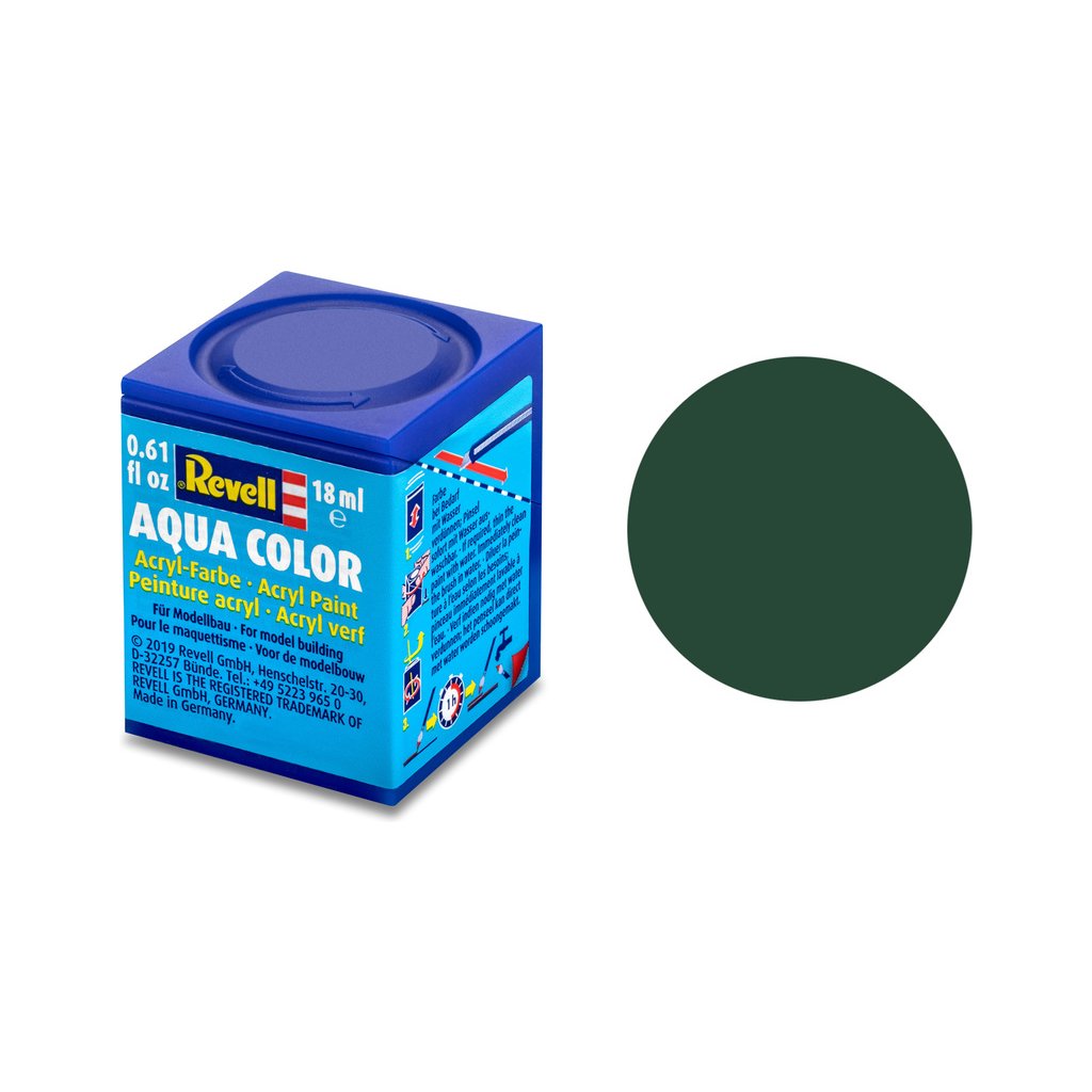 Akrylová barva Revell 36168 pro použití v modelářství. Odstín číslo 68 – tmavě zelená RAF matná. Obsah 18 ml.