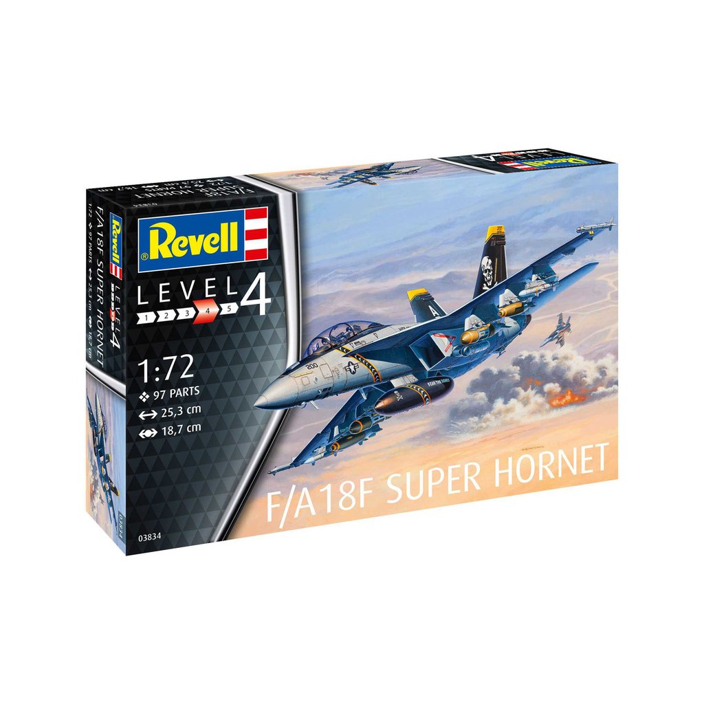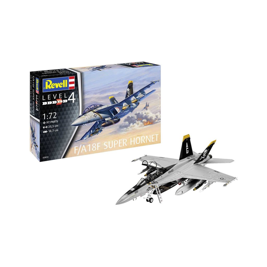 Plastikový model Revell 63834 – Boeing F/A-18F Super Hornet v měřítku 1:72 ke slepení. Stavebnice obsahuje 97 dílků, rozpětí křídel 187 mm, obtížnost 4.