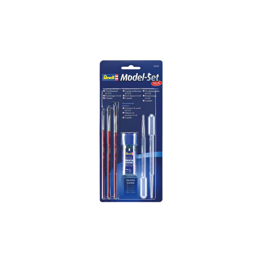 Revell - Sada Model Plus Painting obsahuje 3 štětce ve velikosti 0,3,5 , dvě pipety pro aplikaci ředidla a roztok na umytí štětců.