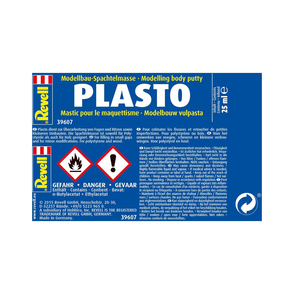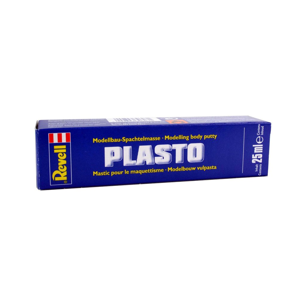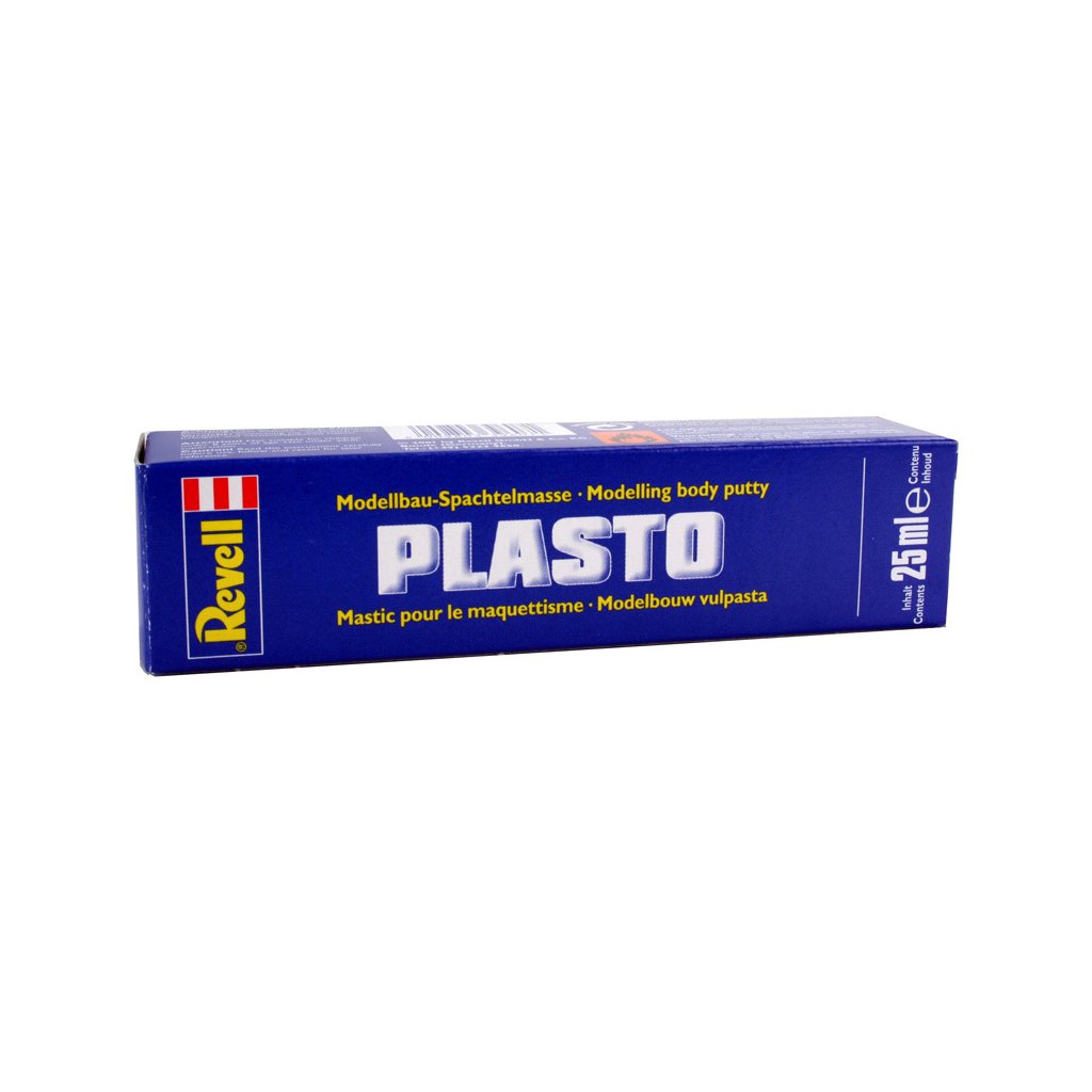 Revell Plasto 39607 je výplňový tmel pro opravy povrchu či vyplňování štěrbin v plastech. Stačí nabrat potřebné množství tmelu na špachtličku a jednoduše zatmelit povrch. Proti dotyku tmel schne asi 1 hodinu, k úplnému vytvrzení dojde typicky za 12 - 48 hodin (doba velmi závisí na tloušťce vrstvy a teplotě). Po vytvrzení lze povrch brousit smirkovým papírem či pilníkem.