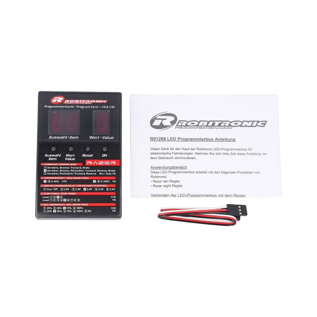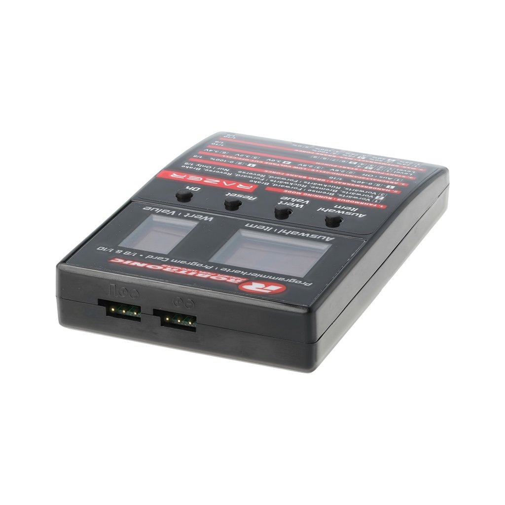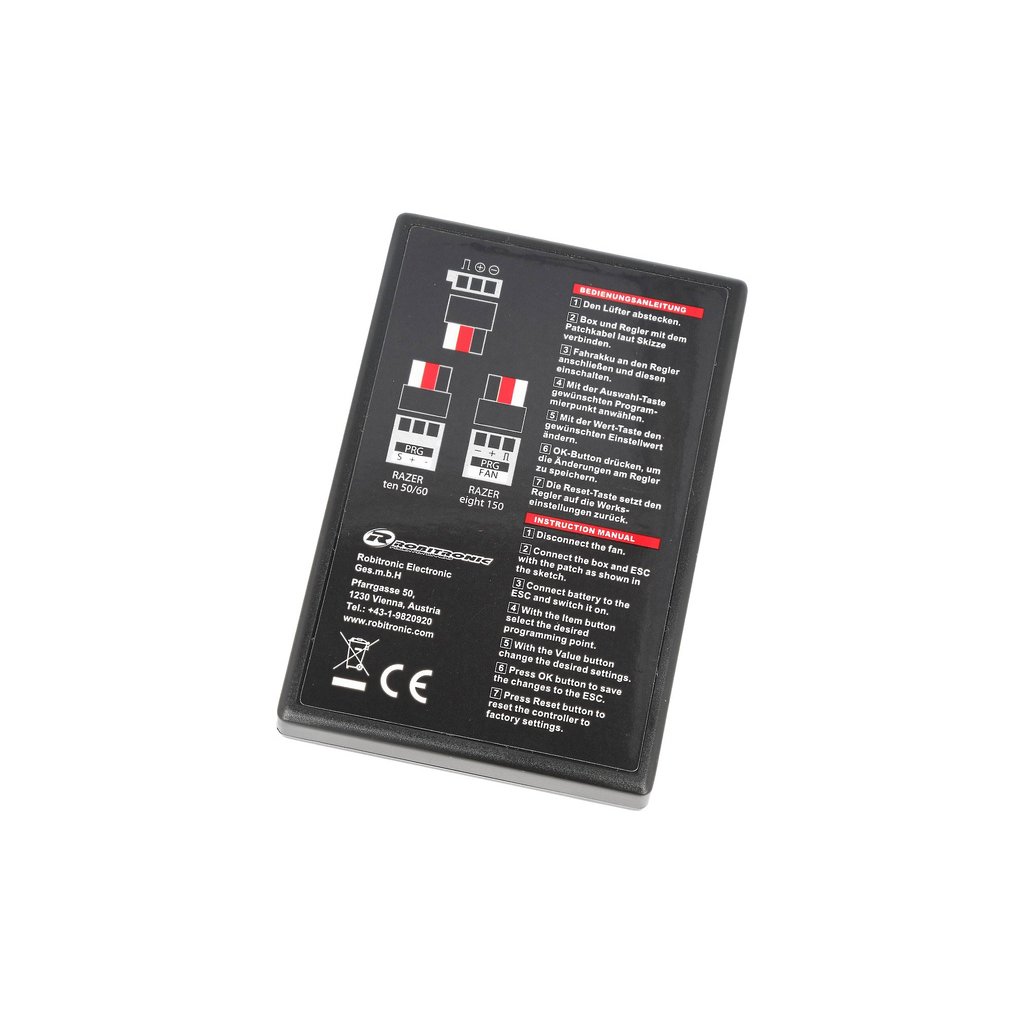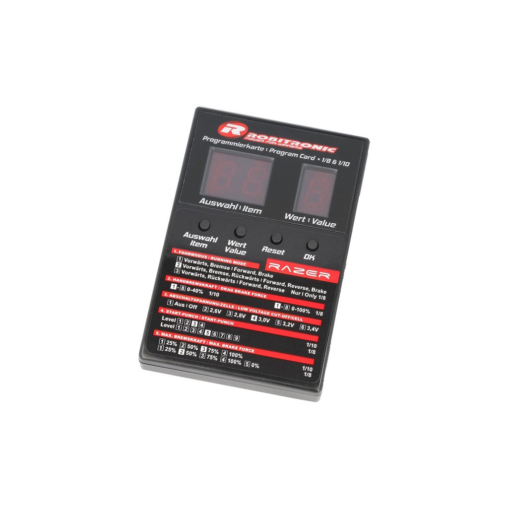 Robitronic programovací karta regulátorů Razer. Přehledné grafické rozhraní umožňuje snadné a přehledné nastavení parametrů regulátorů Robitronic Razer. Stačí jen zvolit funkci, zadat hodnotu a potvrdit! Karta se připojuje do konektoru ventilátoru. Parametr a hodnota jsou zobrazeny na segmentových LED displejích.