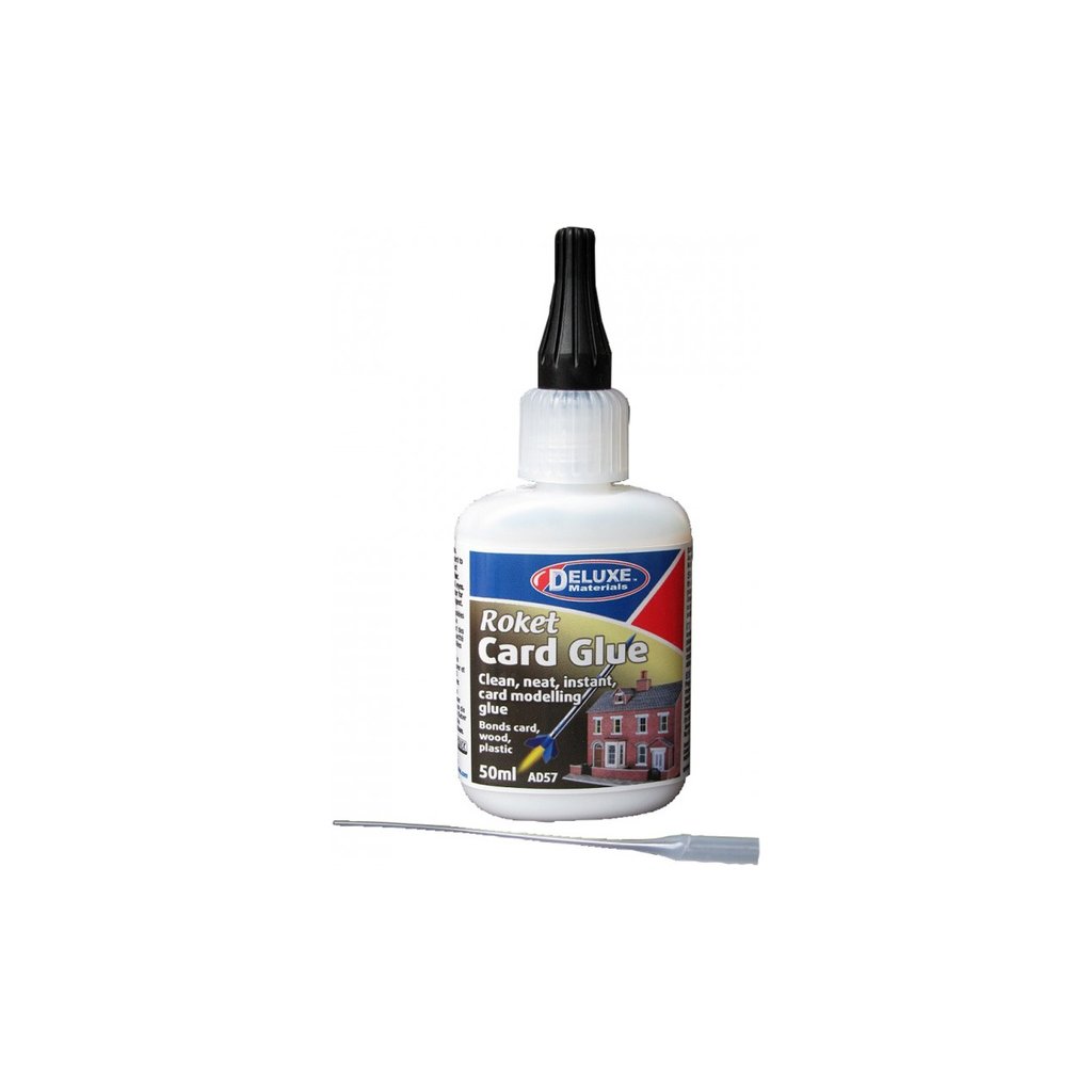 Roket Card Glue univerzální netoxické rychleschnoucí lepidlo po rychlé a pevné slepení, je vhodné pro stavbu z papíru např. stavby pro modelové kolejiště, konstrukce z balsy a dřeva, k lepení kartových modelů. Obsahuje trubičkový aplikátor.