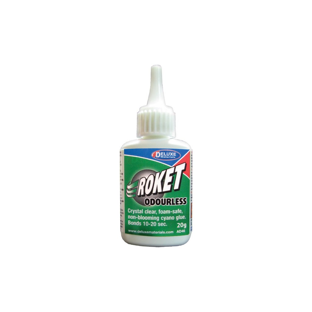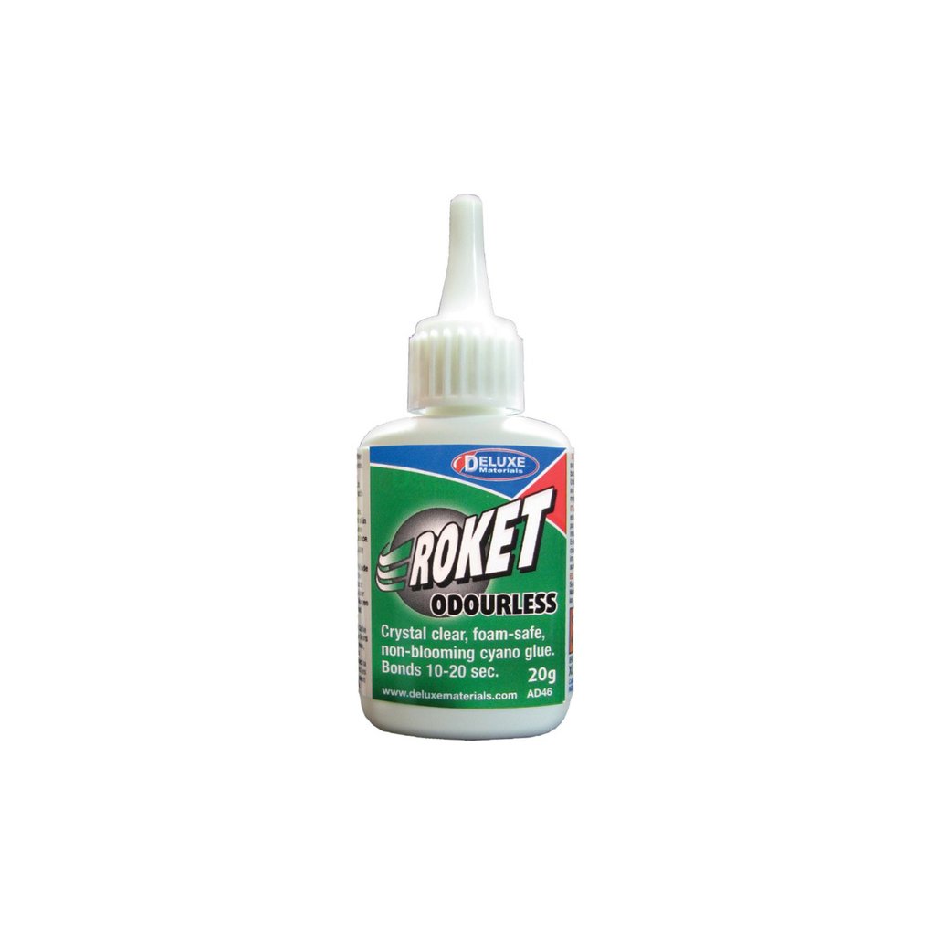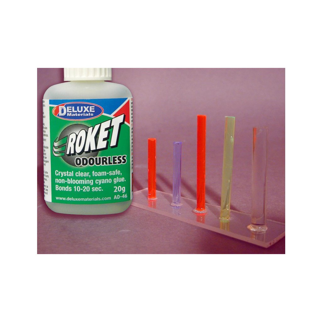 Roket Odourless je kyanokrylátové lepidlo střední konzistence, které lepí bez zápachu. Lepí o 2 až 3 sekundy později, než standardní kyanokrylátová lepidla. Roket Odourless nenapadá pěnové hmoty (polystyren, depron, polypropylen, atd.), proto se výborně lepení těchto hmot s kombinací se dřevem. Spoj je hotový za méně než patnáct sekund.