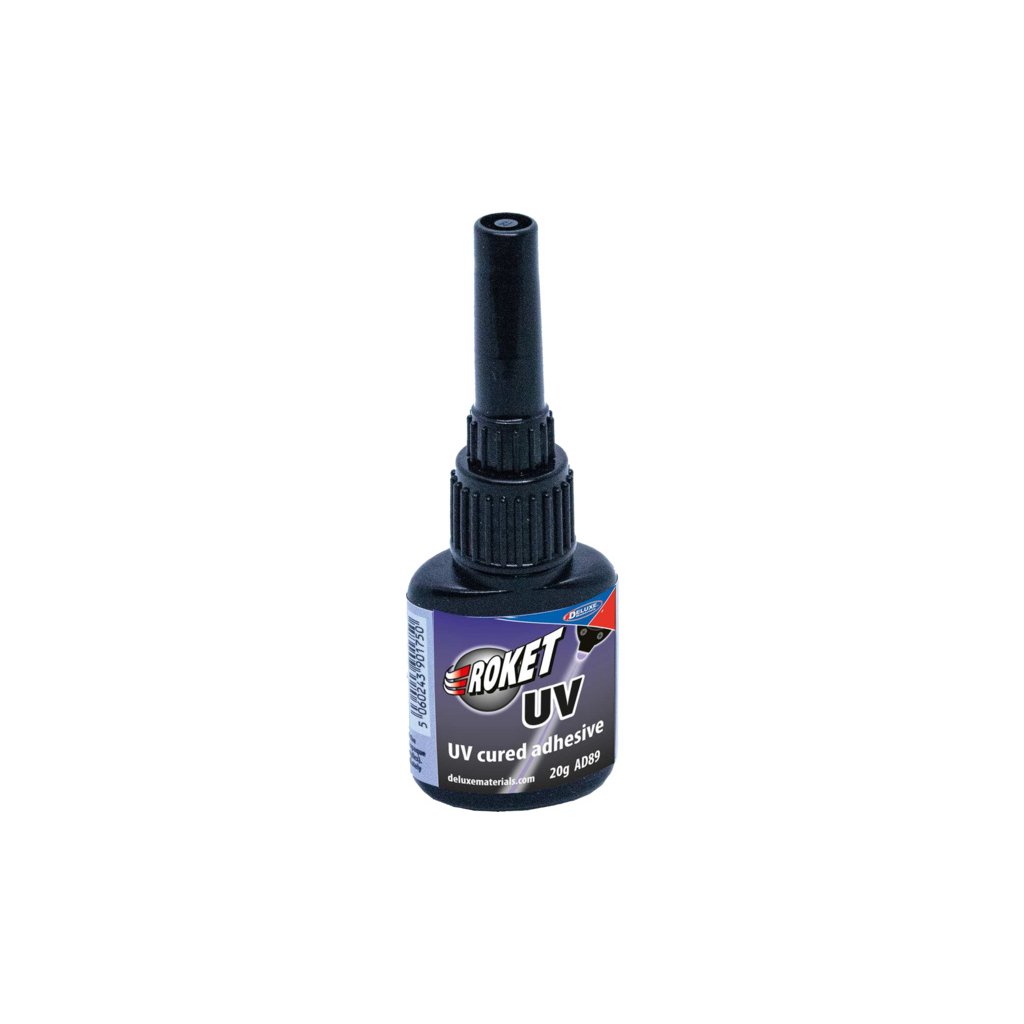 Lepidlo Roket UV od Deluxe Materials patří mezi lepidla, které se vytvrzují UV zářením. Roket UV vytváří zcela čirý spoj, lepí tvrdé plasty, kompozitní materiály, dřevo a kovy.