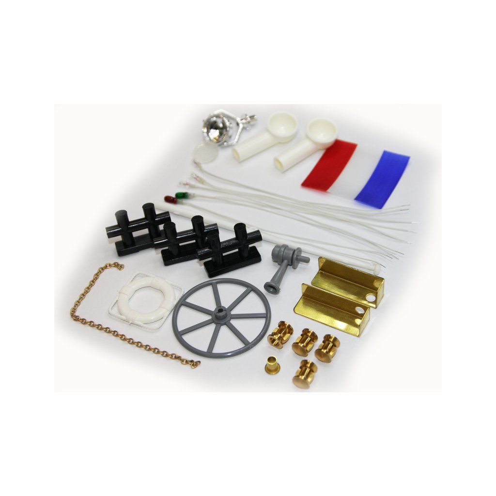 Příslušenství pro RC model lodi ROMARIN Dolly - sada maketových doplňků, jako kolo kormidla, záchranné kolo, světlomet, osvětlení LED, výlisek houkačky, vlajka, řetízek, drobné doplňky.