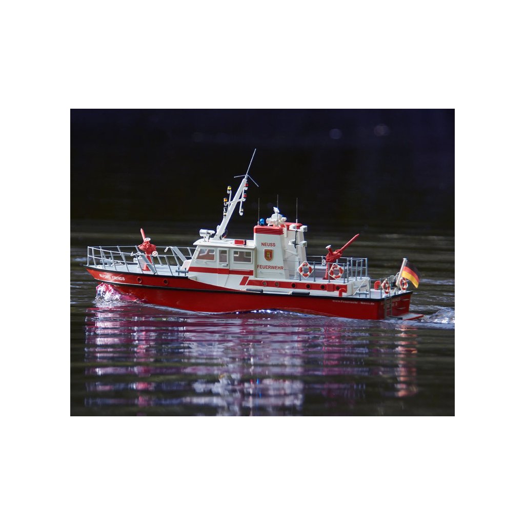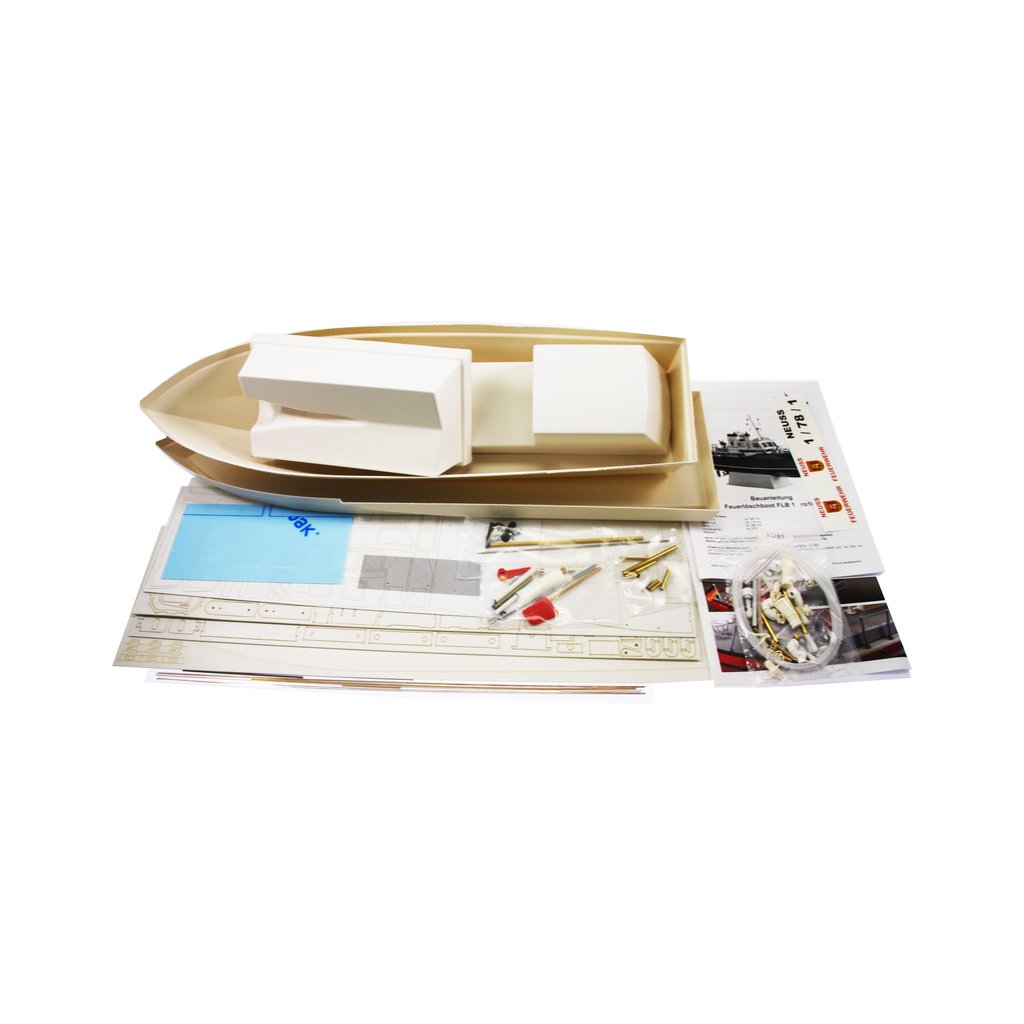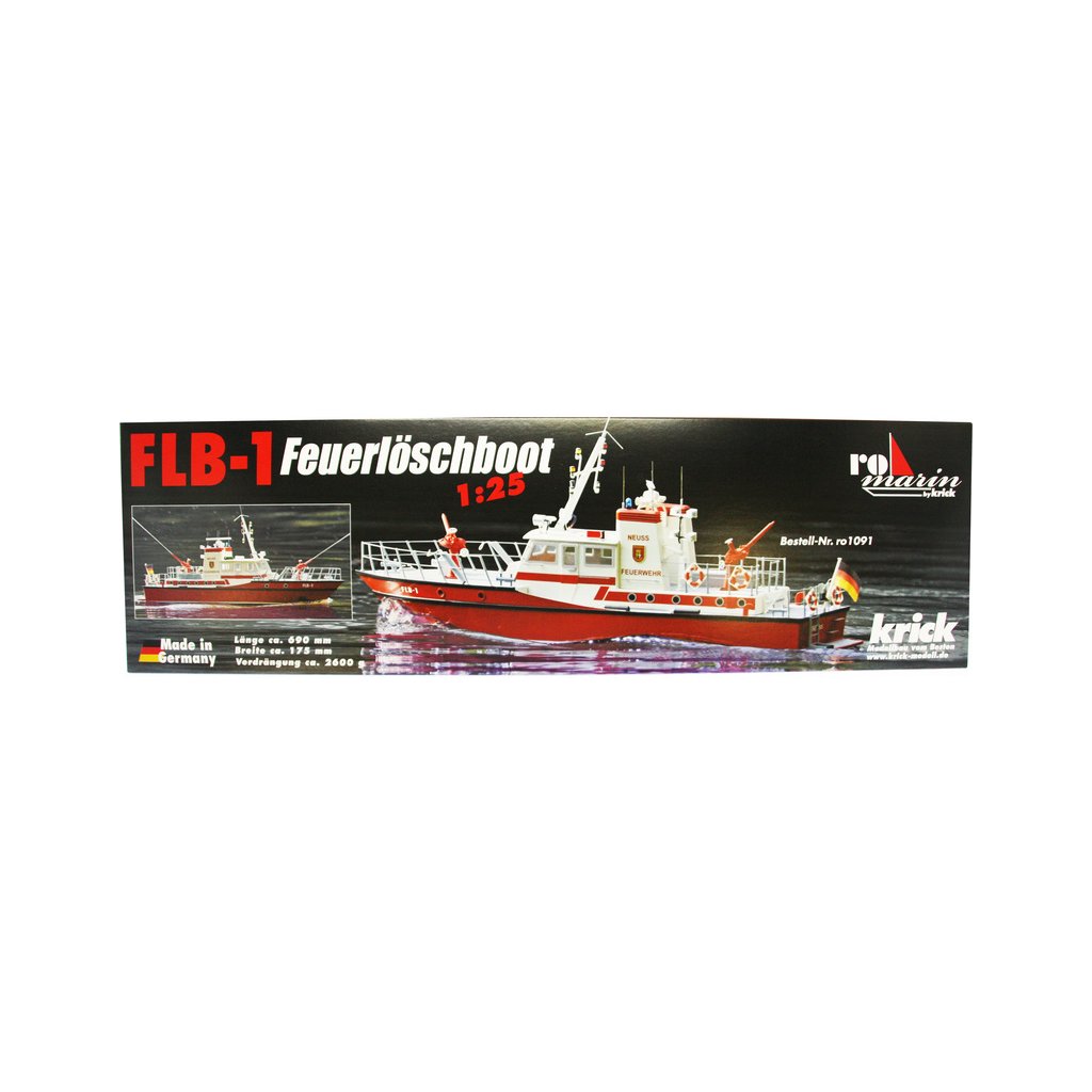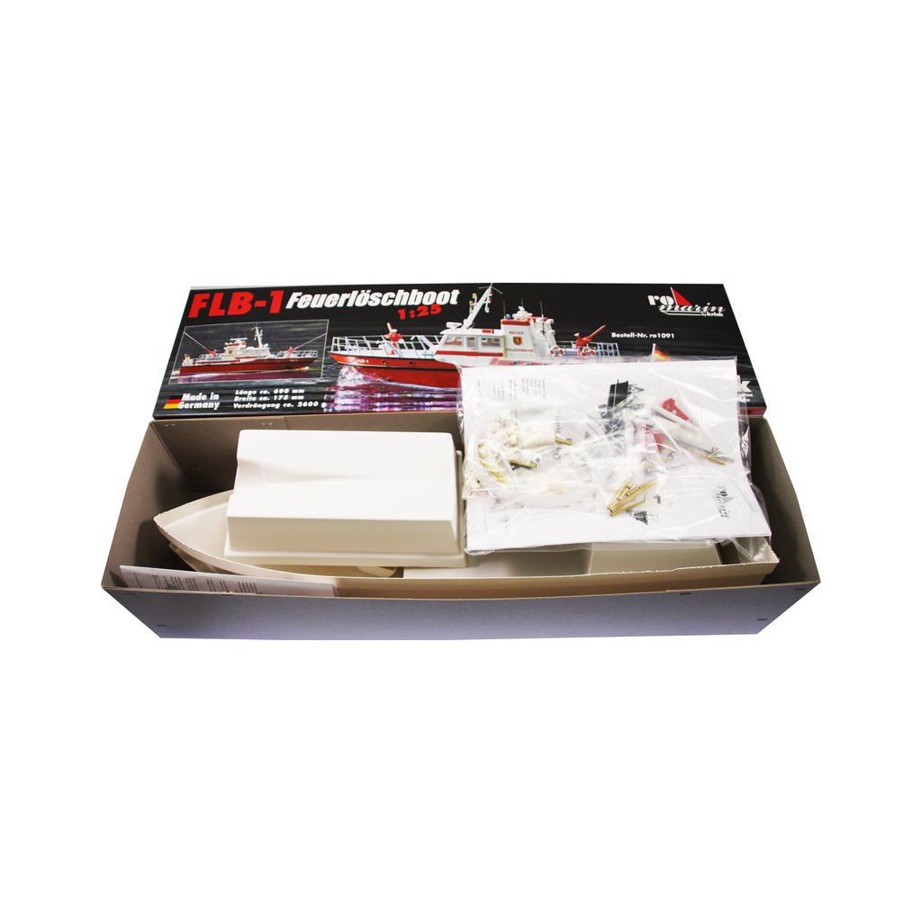 Stavebnice RC modelu lodi na dálkové ovládání od firmy ROMARIN, hasičská loď FLB-1 kit. Vzorem loď FLB-1 na řece Rýn, pro účely požární a záchranné služby. Obsahuje plastové díly trupu a paluby a interiéru, dřevěné součásti, výkres, lodní šroub, maketové díly a drobné stavební příslušenství.