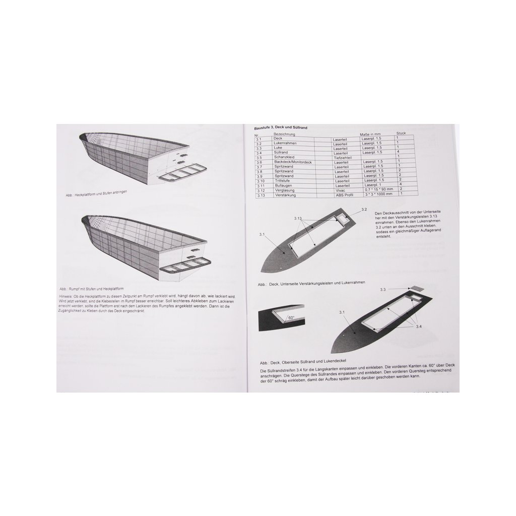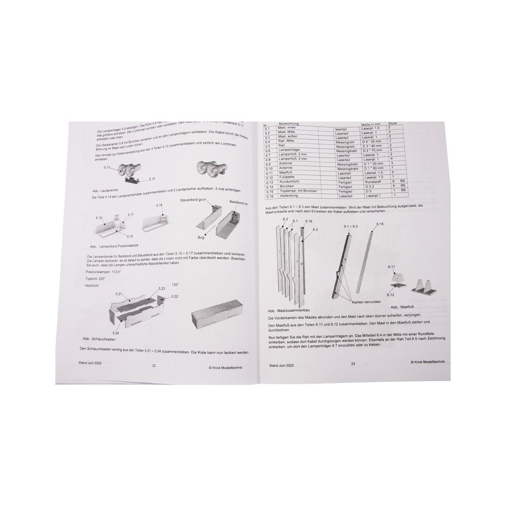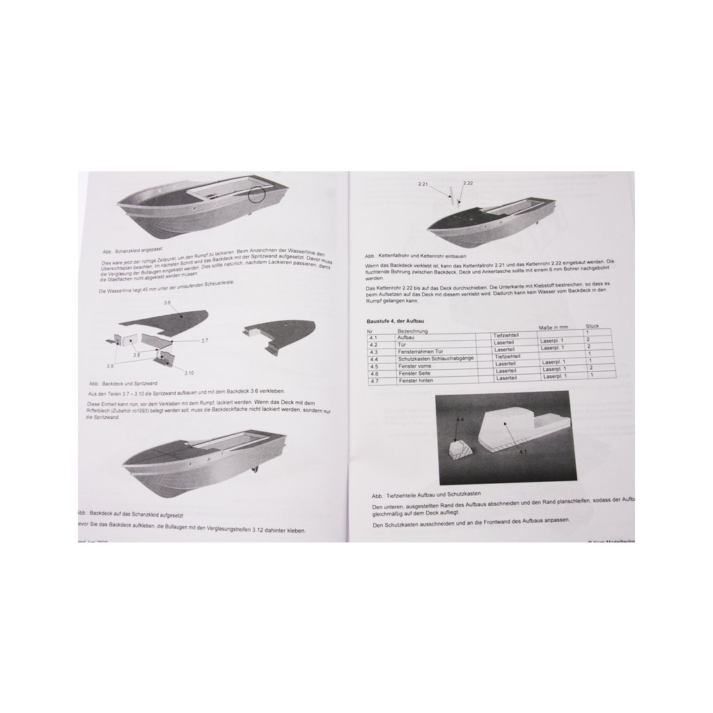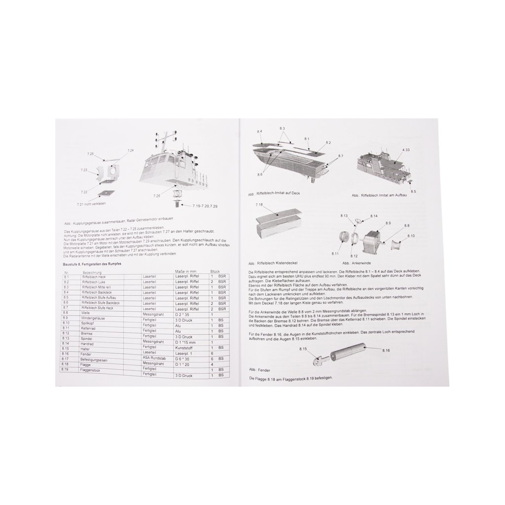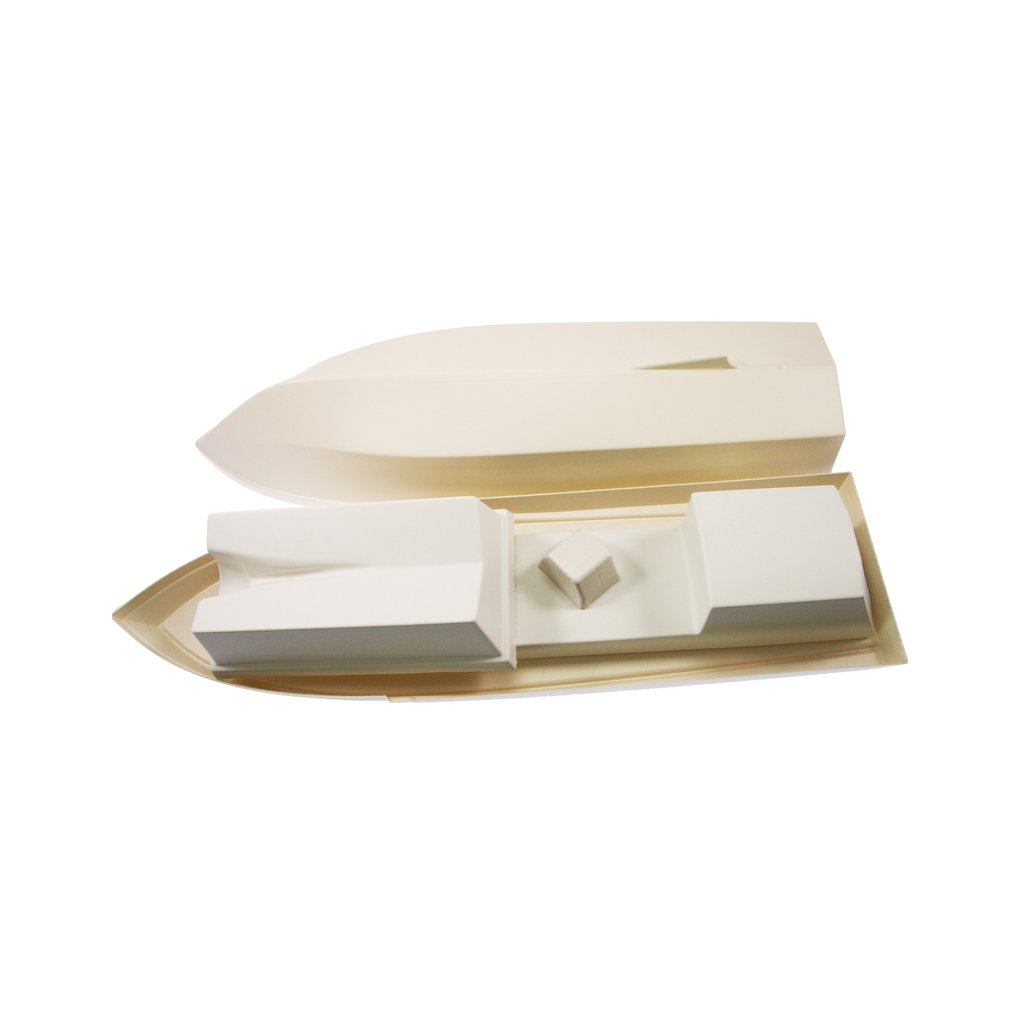 Stavebnice modelu lodi ROMARIN, hasičská loď FLB-1, obsahuje lisovaný trup z ABS plastu, laserem řezané části paluby a nástavby, díly paluby a interiéru, záďovou trubku s hřídelí, spojkou a lodním šroubem, maketové díly a drobné stavební příslušenství, německý manuál s obrázky a český překlad.