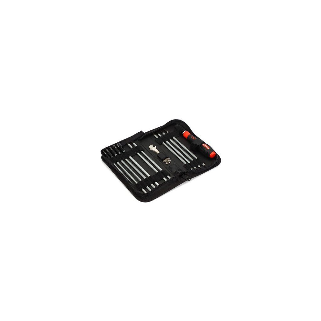 Metrická sada šroubováků a klíče na spojovačky ideální pro auta Losi, Traxxas, Cen, Kyosho, atd. Sada pro hobby použití sestává z celkem 17 výměnných nástavců, klíče na spojovačky a rukojeti.