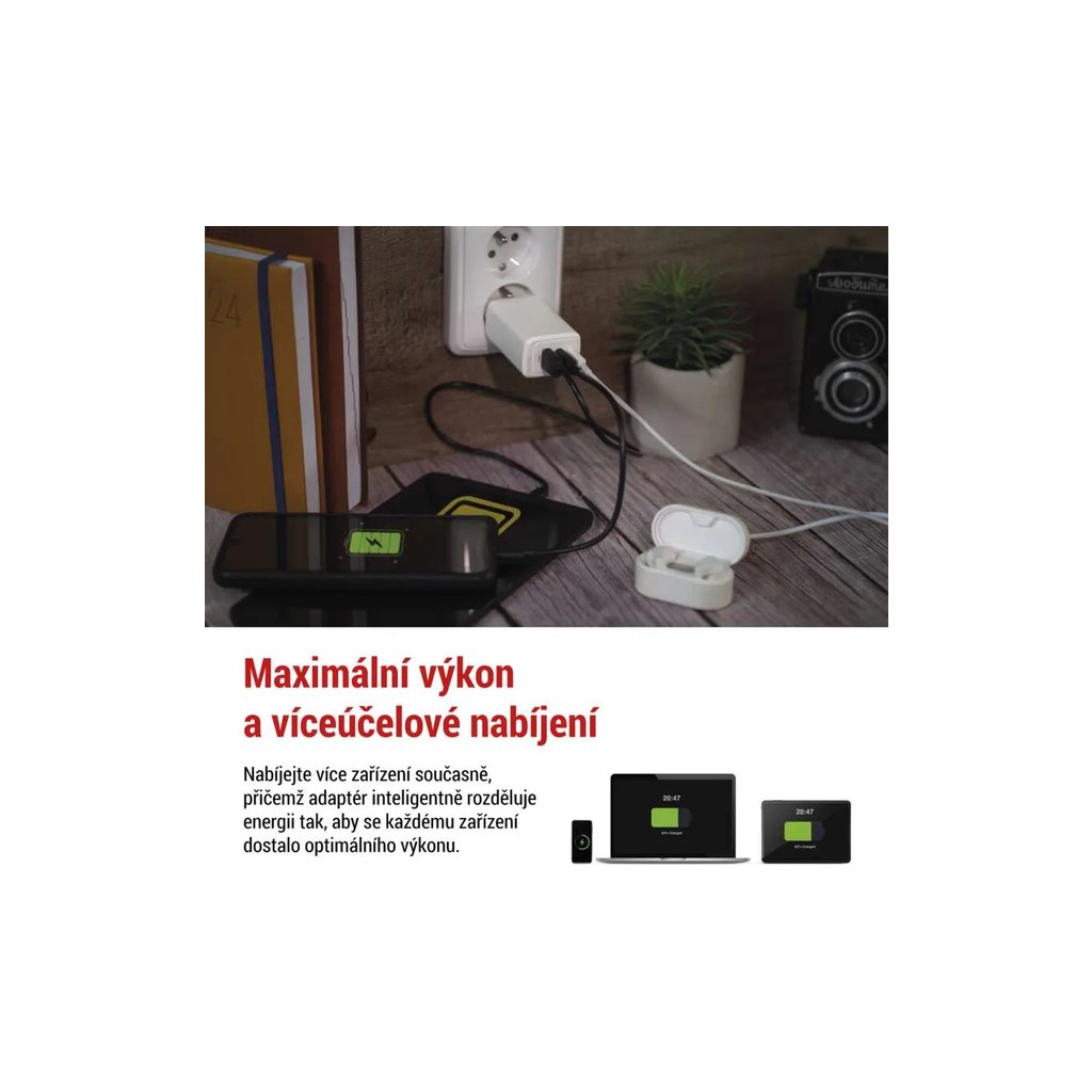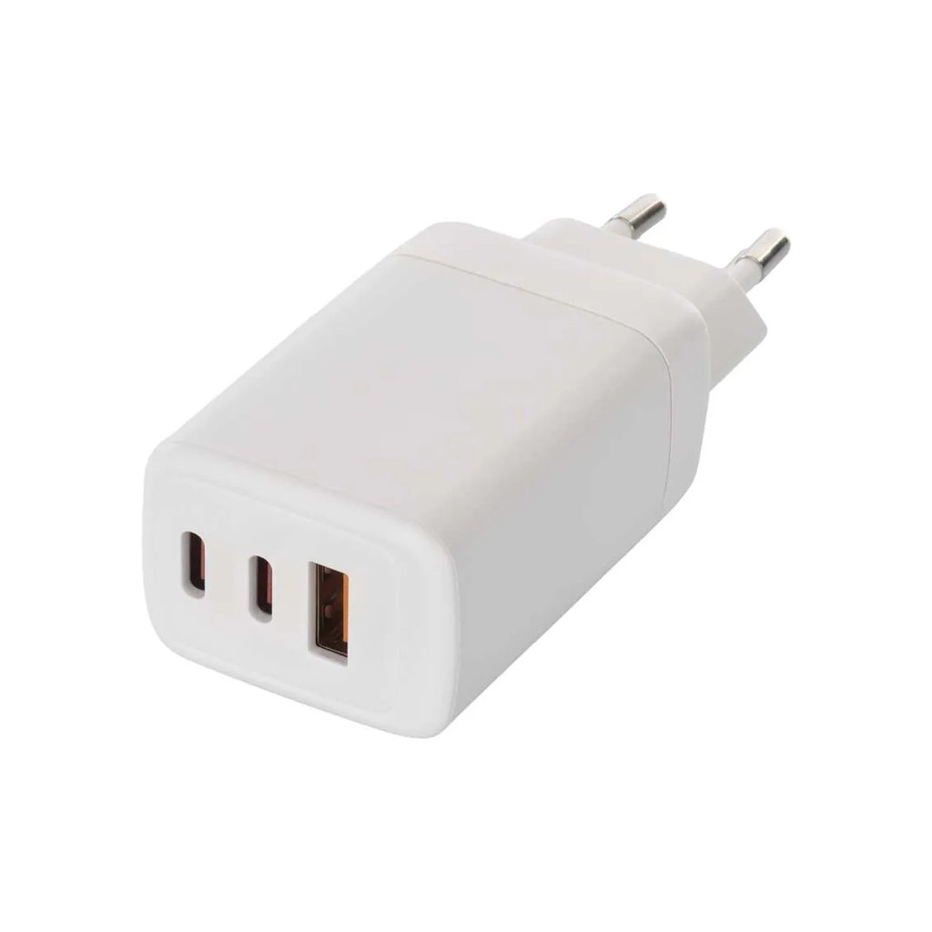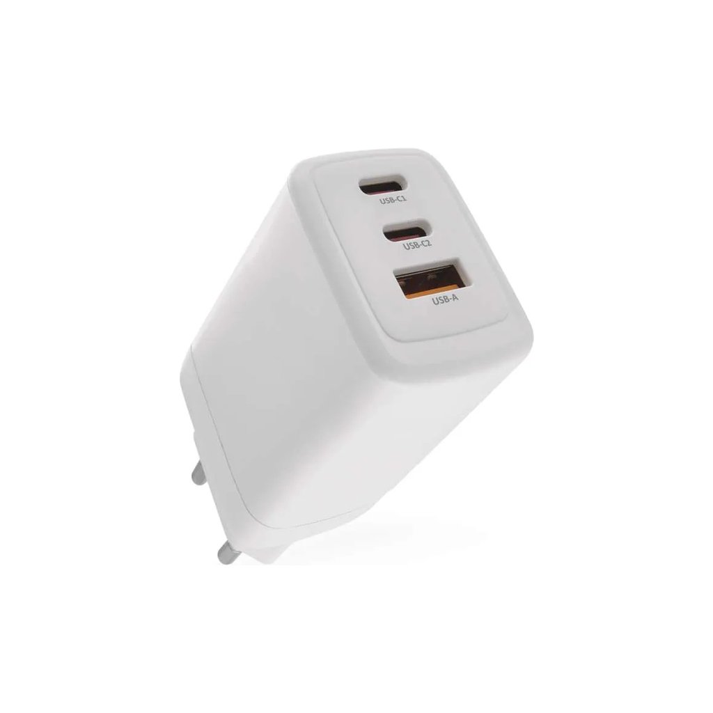 Výkonný univerzální síťový adaptér USB s výkonem až 65W a třemi výstupy - 1x USB‑A (klasický), 2x USB‑C. Adaptér zajistí rychlé a spolehlivé nabíjení a napájení telefonů, tabletů, notebooků, USB nabíječů a dalších zařízení. Tranzistory s Nitridem Galia poskytují vysokou účinnost při zachování kompaktních rozměrů. Automatické a efektivní rozdělení výkonu na jednotlivé výstupy dle požadavků připojených zařízení.