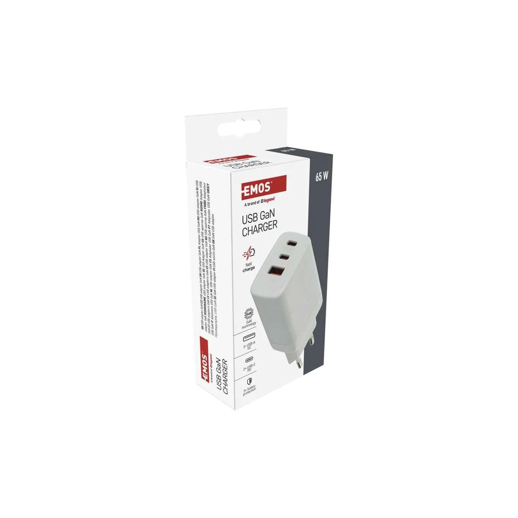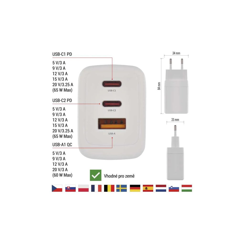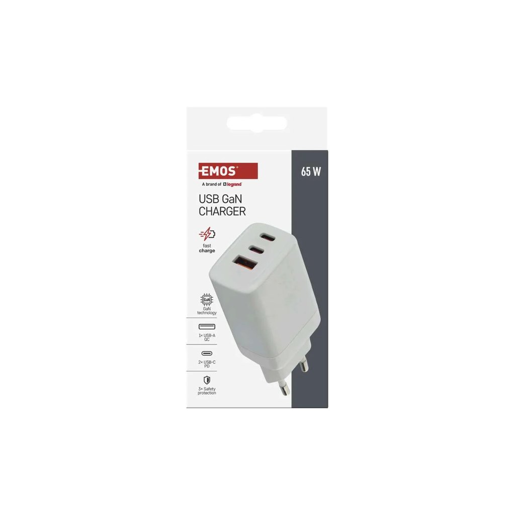 Výkonný univerzální síťový adaptér USB s výkonem až 65W a třemi výstupy - 1x USB‑A (klasický), 2x USB‑C. Adaptér zajistí rychlé a spolehlivé nabíjení a napájení telefonů, tabletů, notebooků, USB nabíječů a dalších zařízení. Tranzistory s Nitridem Galia poskytují vysokou účinnost při zachování kompaktních rozměrů. Automatické a efektivní rozdělení výkonu na jednotlivé výstupy dle požadavků připojených zařízení.