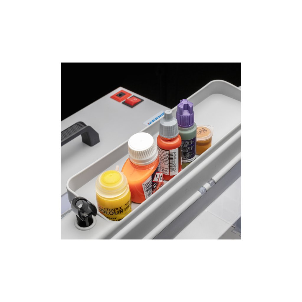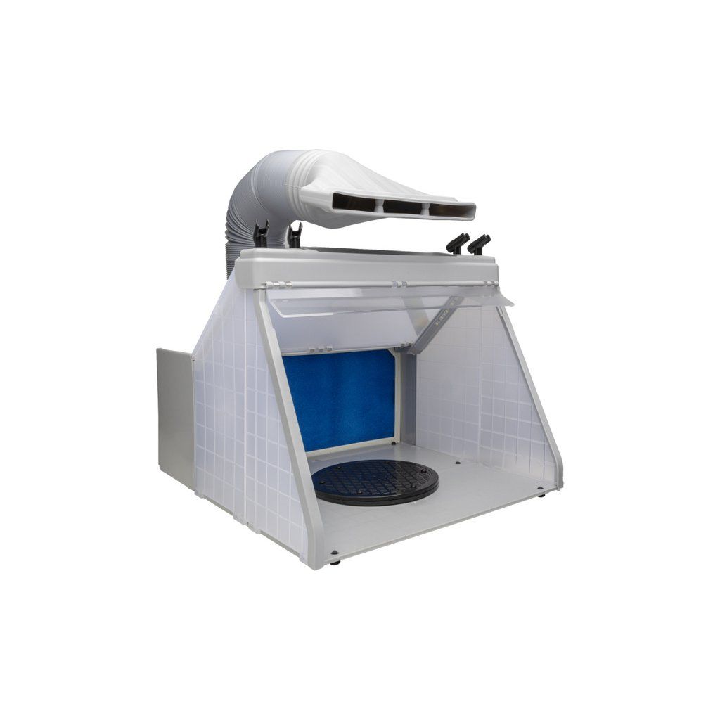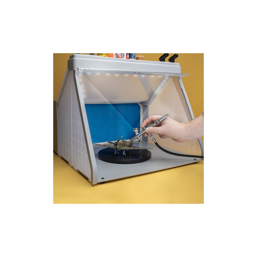 Spraycraft stříkací box s odsáváním, otočným stolem 190 mm, ventilační hadicí a filtrem. Napájení 230 - 240 V/50 Hz, sací výkon 3 m³/min, pracovní vnitřní prostor 41x35x30cm. Stříkací box je praktické řešení pro všechny modeláře, hobby tvůrce i profesionály, kteří pracují s airbrushem a aerosolovými spreji. Box pomáhá zachytit přebytečnou barvu a výpary při stříkání, čímž udržuje pracovní prostor čistý a zlepšuje pracovní podmínky. Díky integrovanému odsávání a filtračnímu systému se dvěma filtry zachytí většinu rozprášených částic barvy. Tři integrované LED světelné pásky zaručují dobrou viditelnost při práci. Na vrchní straně boxu je přihrádka pro lahvičky od barev a držáky pro stříkací pistole.