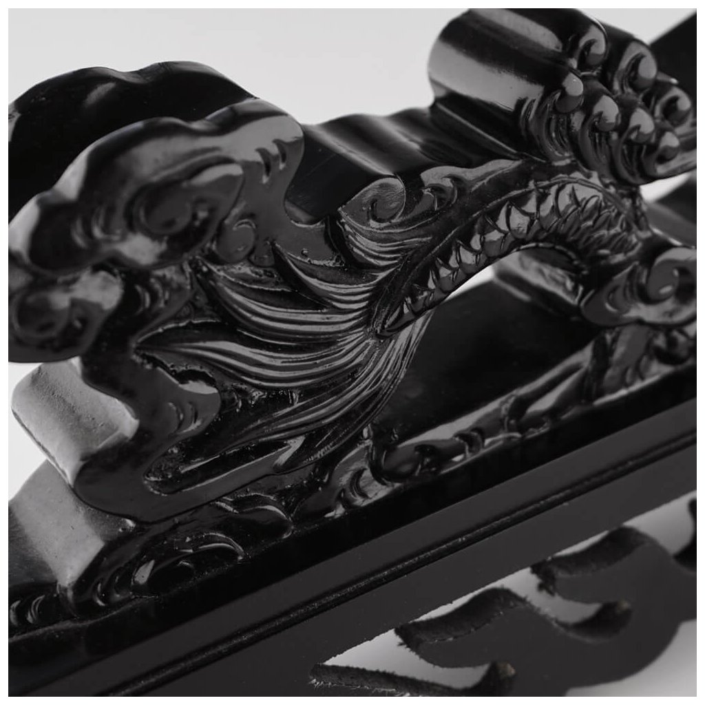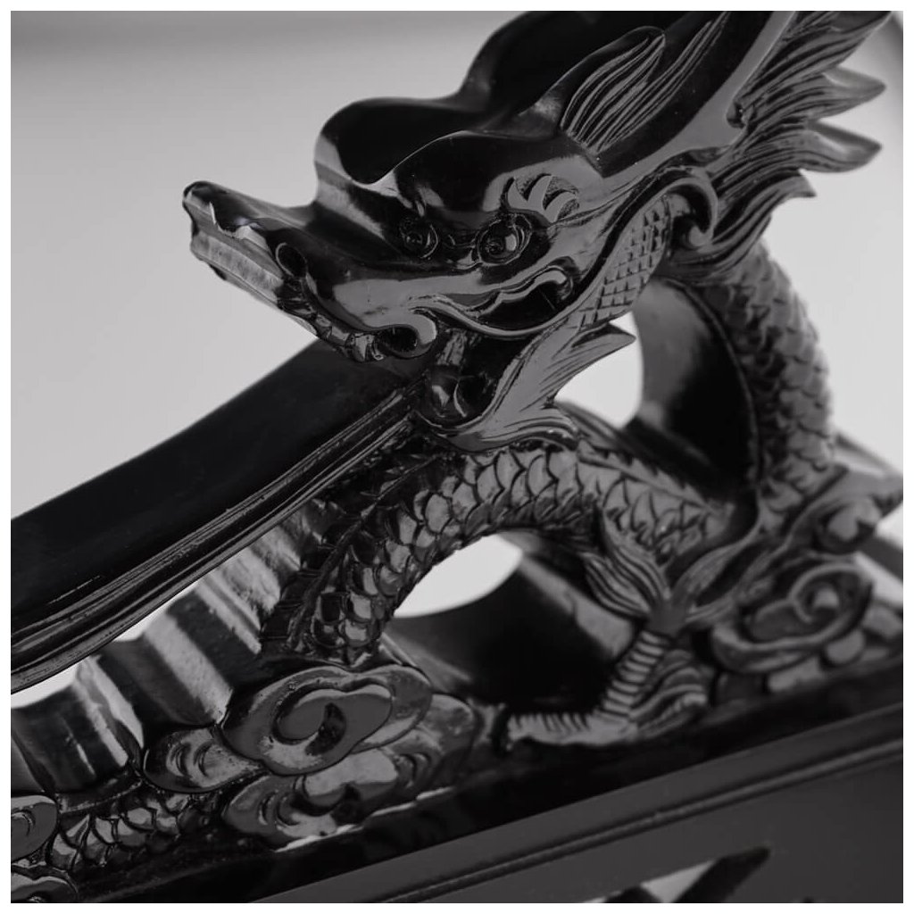 Prezentujte svůj oblíbený meč, katanu, wakizashi nebo tanto stylově na tomto unikátním výstavním stojanu. Tento krásný stojánek ve tvaru draka je vyroben z dřevěného masivu a jeho povrch je opatřen černým lakem ve vysokém lesku. Drak jako symbol síly a ochrany dodá vaší sbírce autentickou atmosféru.