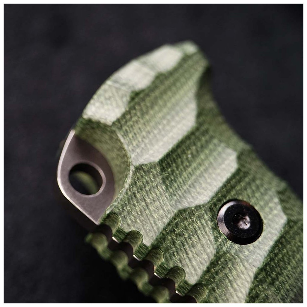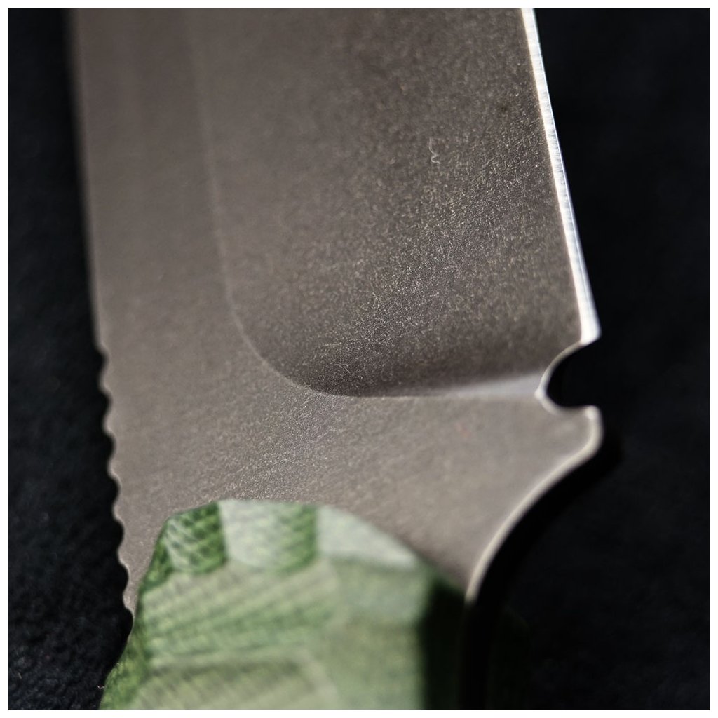 Nůž je navržen tak, aby obstál při dlouhodobém nasazení v náročném terénu. Ergonomická rukojeť z kompozitního materiálu Micarta v přírodním zeleném provedení zajišťuje bezpečný úchop i v dešti nebo v rukavicích. Texturovaný povrch poskytuje maximální kontrolu při řezání či přípravě dřeva. V zadní části rukojeti se nachází praktický otvor pro provlečení paracordu.