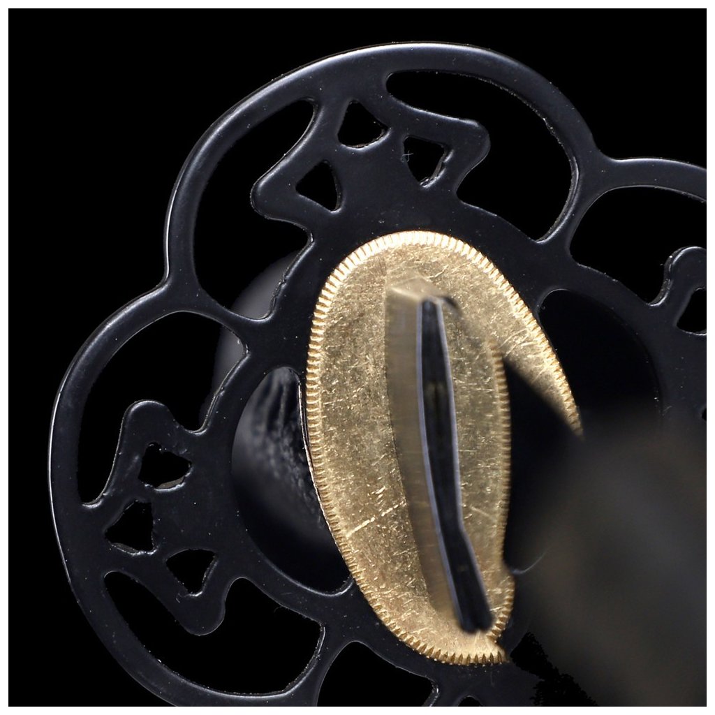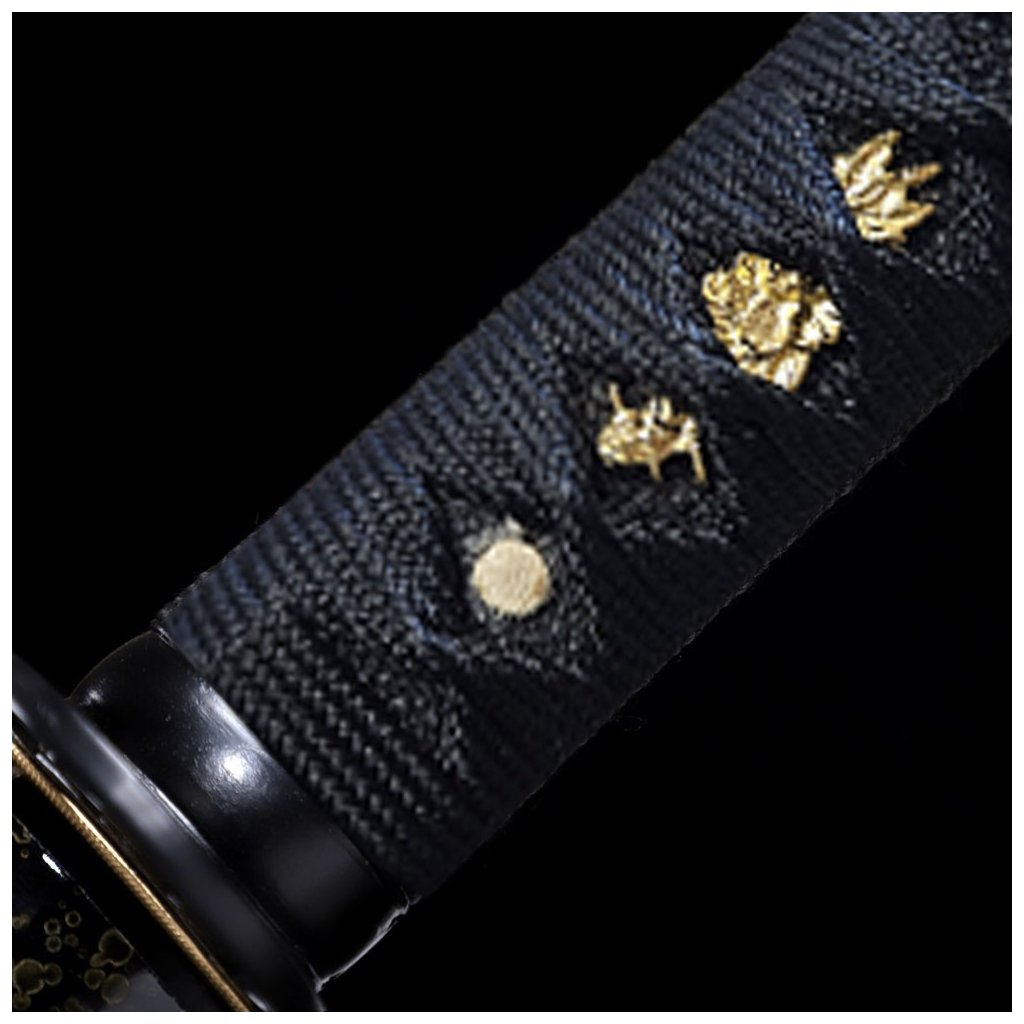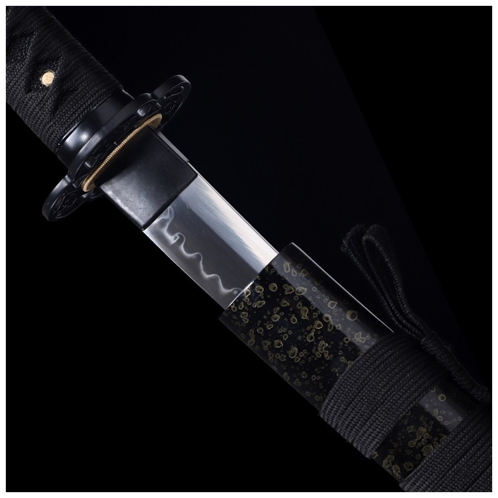 Kované ostré elegantní tanto Kuro Hebi představuje špičkovou kombinaci funkčnosti a japonského dekorativního umění. Čepel je vyrobena z vysoce kvalitní uhlíkové oceli T-10 a díky parciálnímu kalení nese autentický Choji hamon. S tvrdostí 58 HRC a konstrukcí full-tang je tento nůž připraven na aktivní nácvik bojových umění. Dominantou meče je černá lesklá saya se zlatým vzorem připomínajícím jemné bublinky v laku, vytvořená v tradičním stylu urushi.