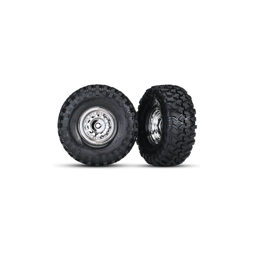 Kompletní univerzální kola. Chromované disky s pneumatikami Canyon Trail pro TRX-4 Ford Bronco (2 ks v balení). Pro použití v jiný modelech TRX-4, je nutné mít na modelu hřídel TRA8255A.